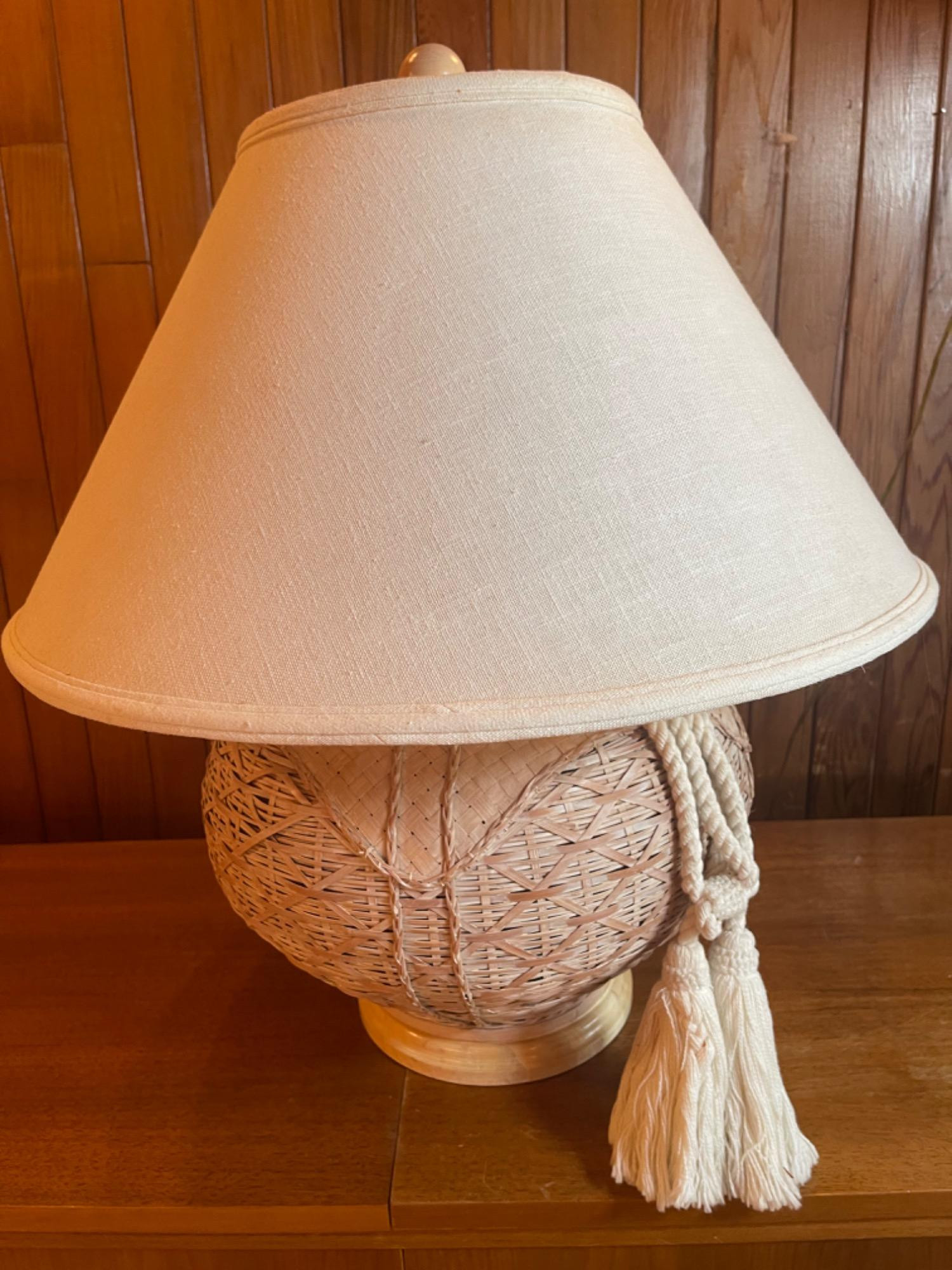Lamp: 24 inches tall Shade has a few dents, but otherwise good condition. Light has been tested and turns on.