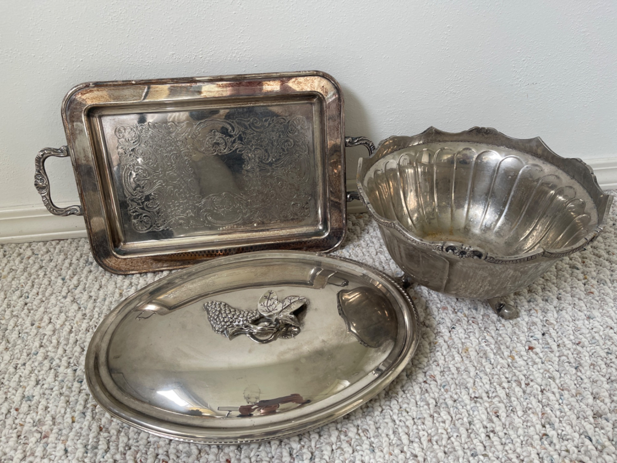 Tray: 17 inches x 10 inches - Eales 1779 Silverplate Bowl: 10 inch x 6.5 inches Covered platter: 14.5 inches x 10 inches All need cleaning as they have some tarnishing.