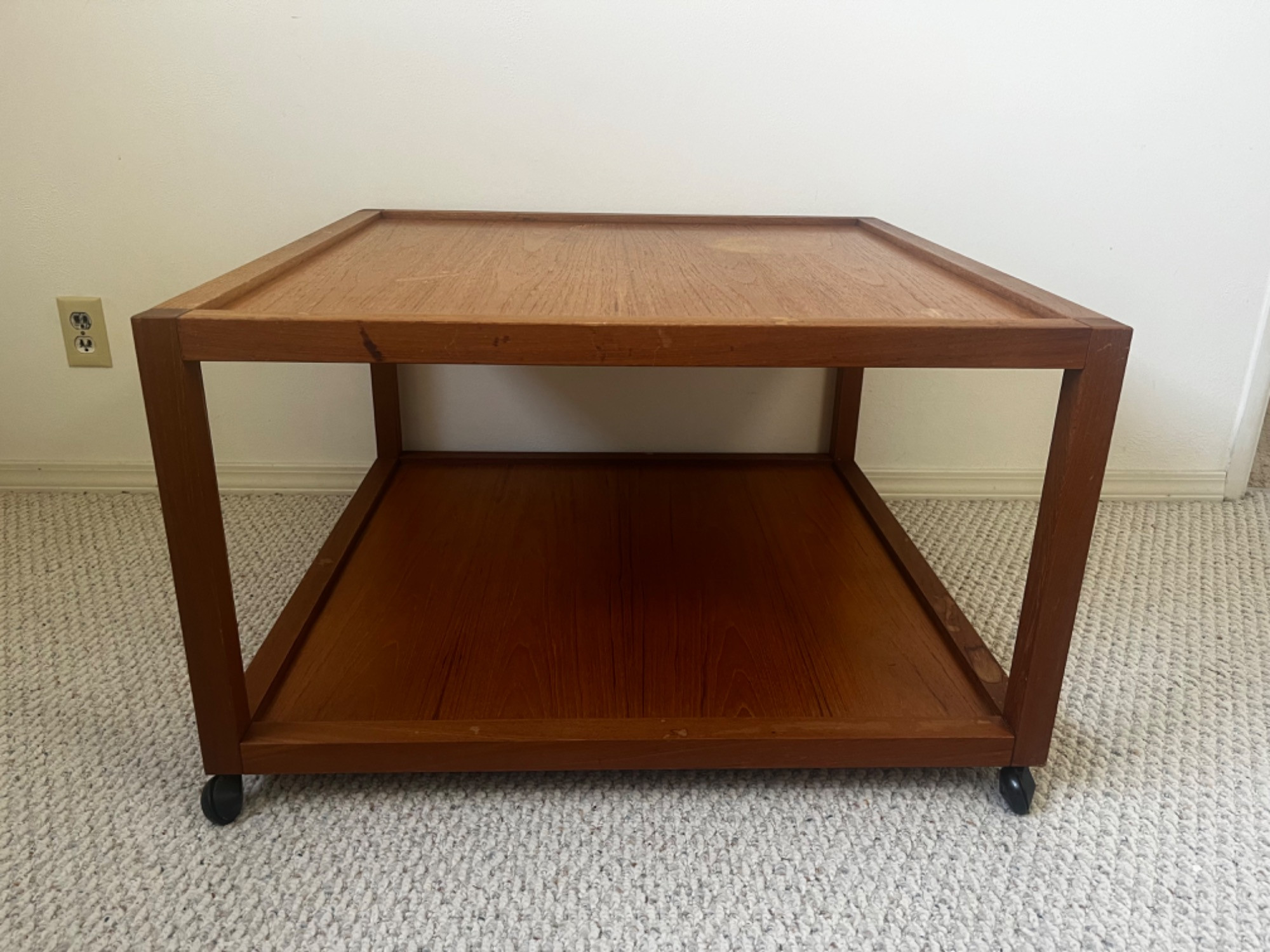 Vintage Nordisk Andels-Eskport Rolling Coffee Table Measurements: 17 inches x 31.5 inches x 31.75 inches Discoloring and rings on wood, but no major chips or chunks missing. Wheels work fine. Bidding on this lot is an agreement that: (1.) You