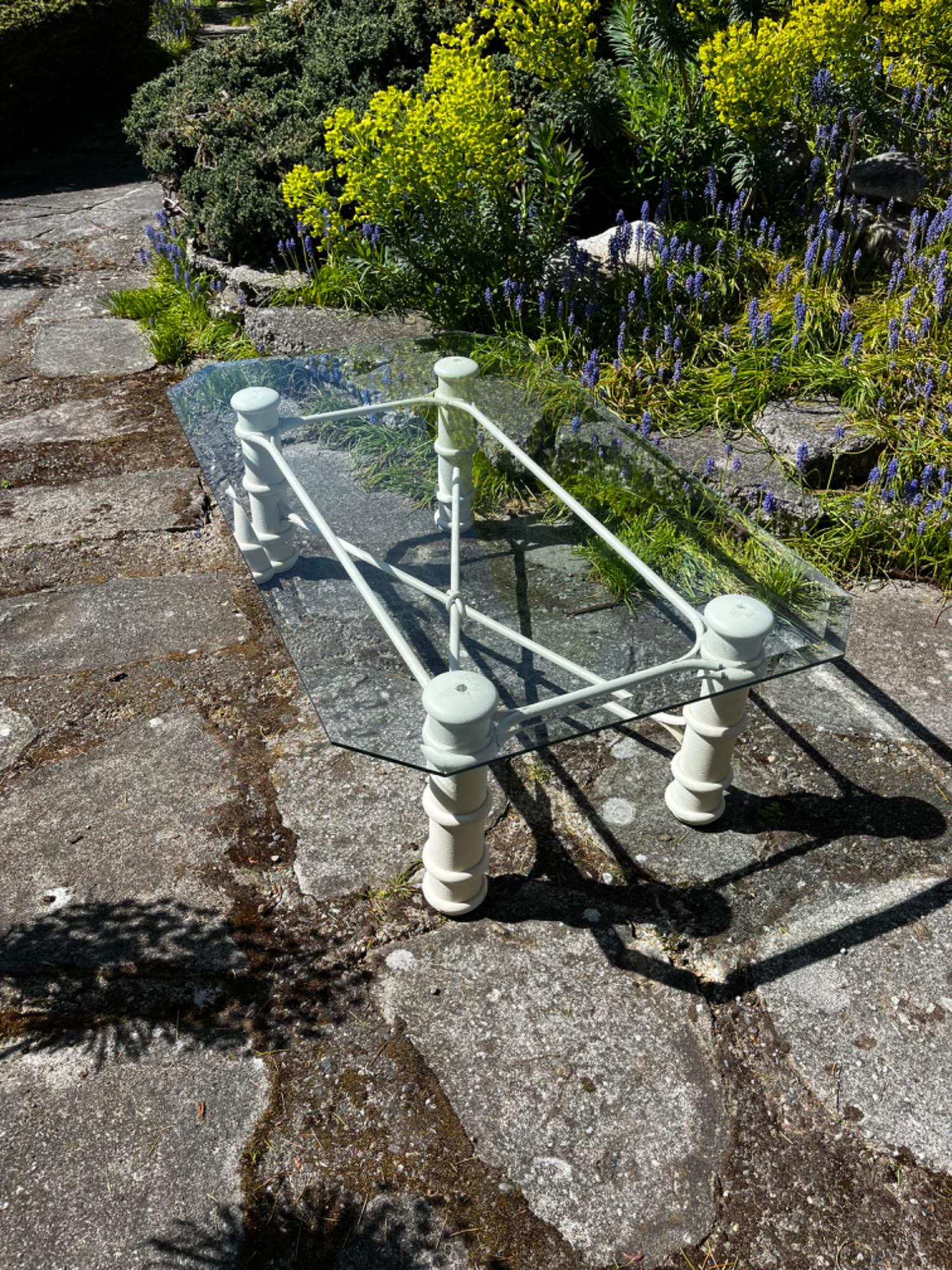 This table was photographed outside, but has been kept inside. Table base: 16 inches x 21 inches x 42 inches - Some loss of paint on points of contact with table top, as well as some on support beams, doesn’t look like there’s any damage structurally Table Top: 30 inches x 50 inches - Some large scratches on table top - Some stains from items previously on top Bidding on this lot is an agreement that: (1.) You