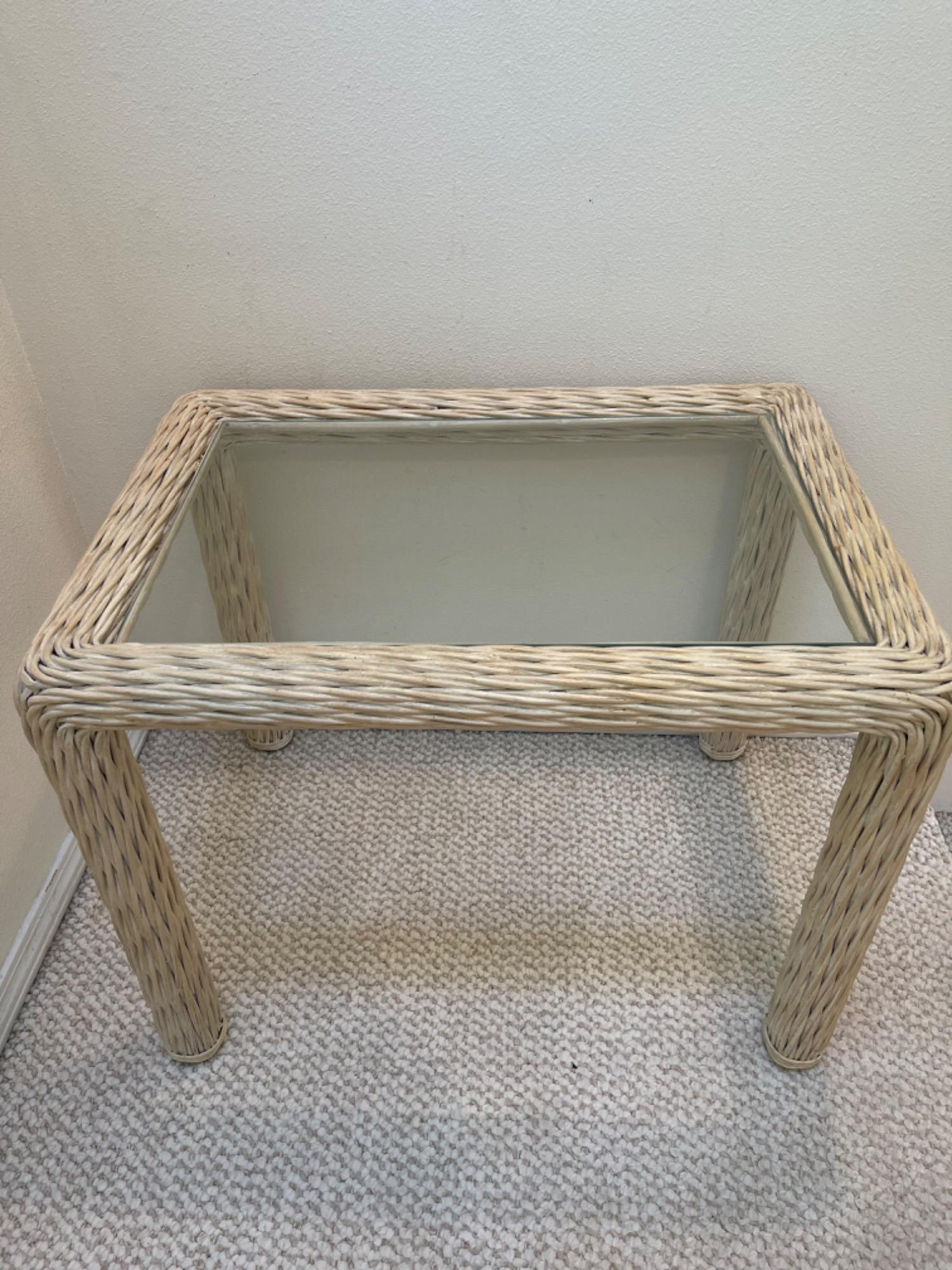There are scratches to glass top. Wood has some stains due to wear. Needs some cleaning. Measurements: 30 inches x 22 inches x 24 inches Bidding on this lot is an agreement that: (1.) You