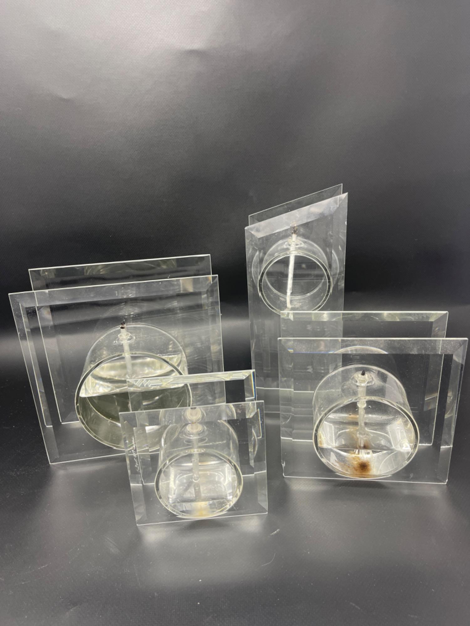 Tallest: 8.5 inches tall Shortest: 4 inches tall Most have some small chips to edges and corners. All have small scratches and need thorough cleaning.
