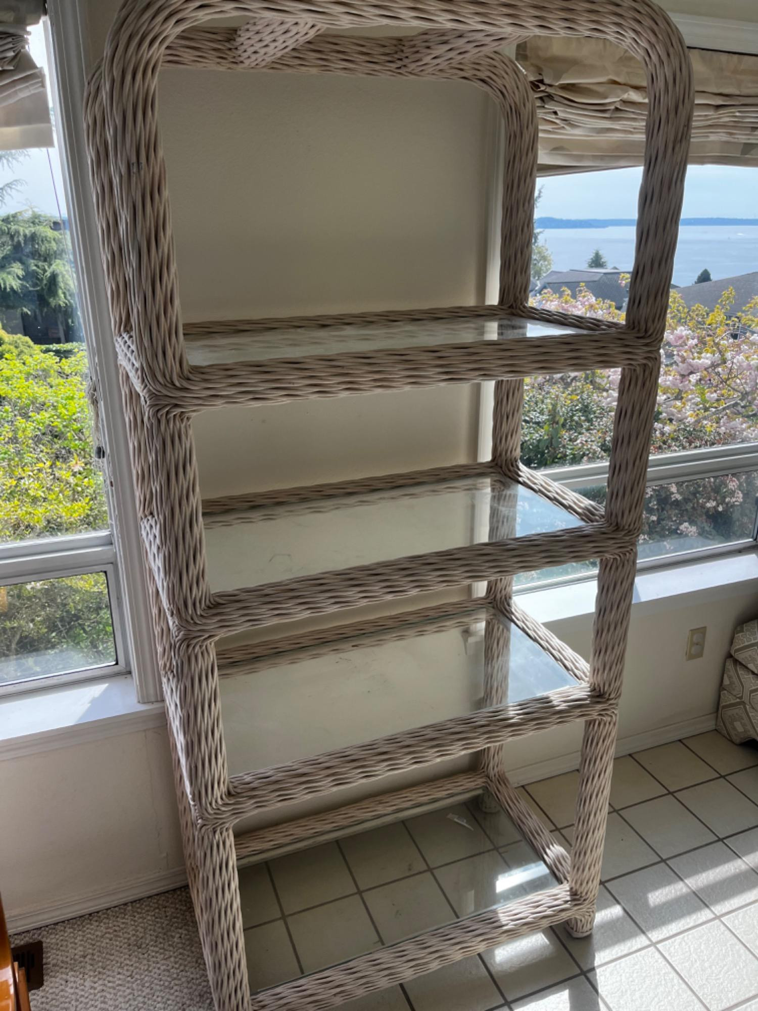 Measurements: 20.5 inches x 37 inches x 78.5 inches Wicker is in good condition with few snags or rips. Glass doesn’t appear to have many scratches with a few small ones on each shelf. Very sturdy. Bidding on this lot is an agreement that: (1.) You