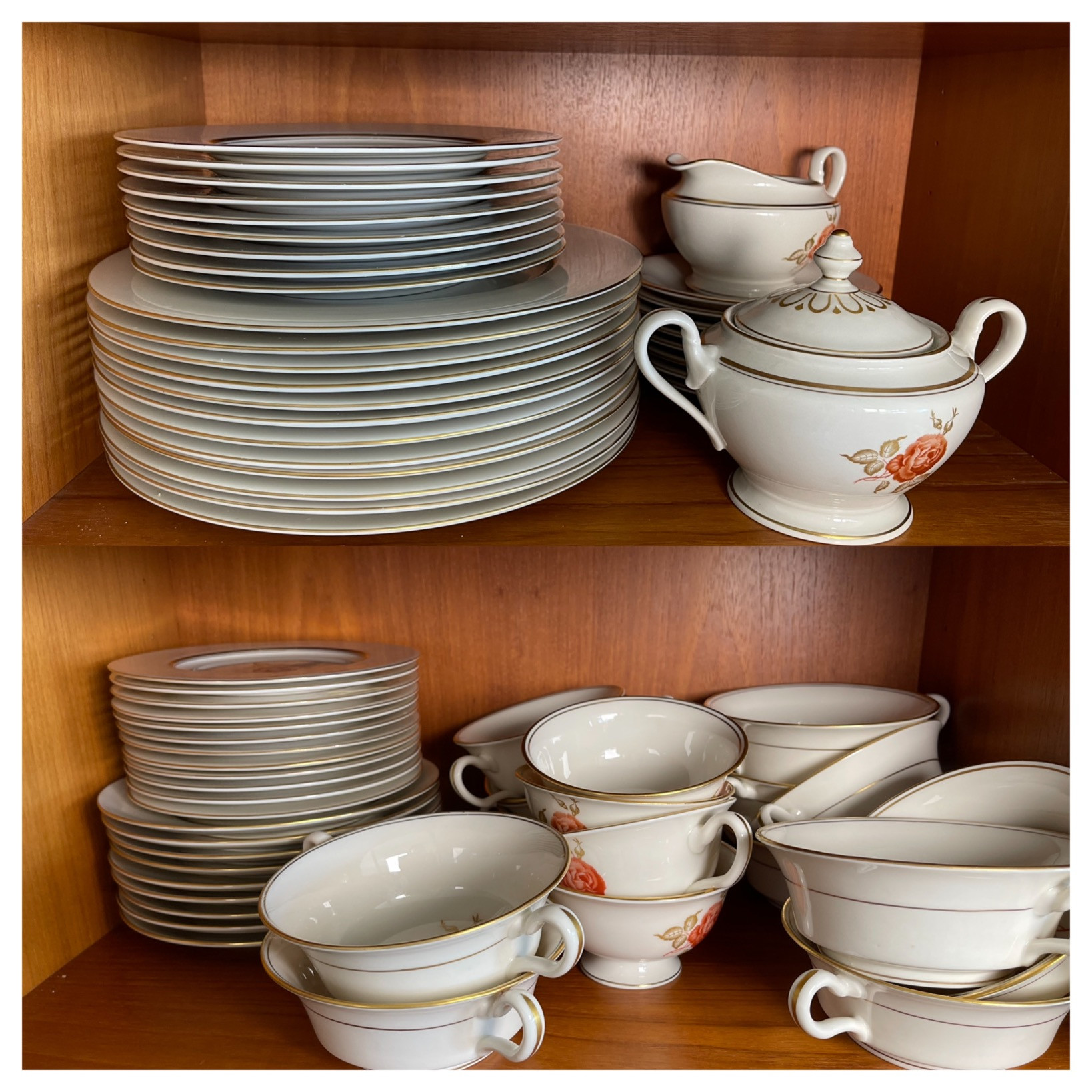(12) Dinner Plates: 10.5 inches wide (9) Salad Plates: 8.5 inches wide (9) Dessert Plates: 7 inches wide (12) B&B Plates: 6.25 inches wide (8) Saucers: 6 inches wide (8) Tea cups: 4 inches x 2 inches (9) Bowls: 5 inches x 1.75 inches (1) Sugar jar: 5.25 inches tall