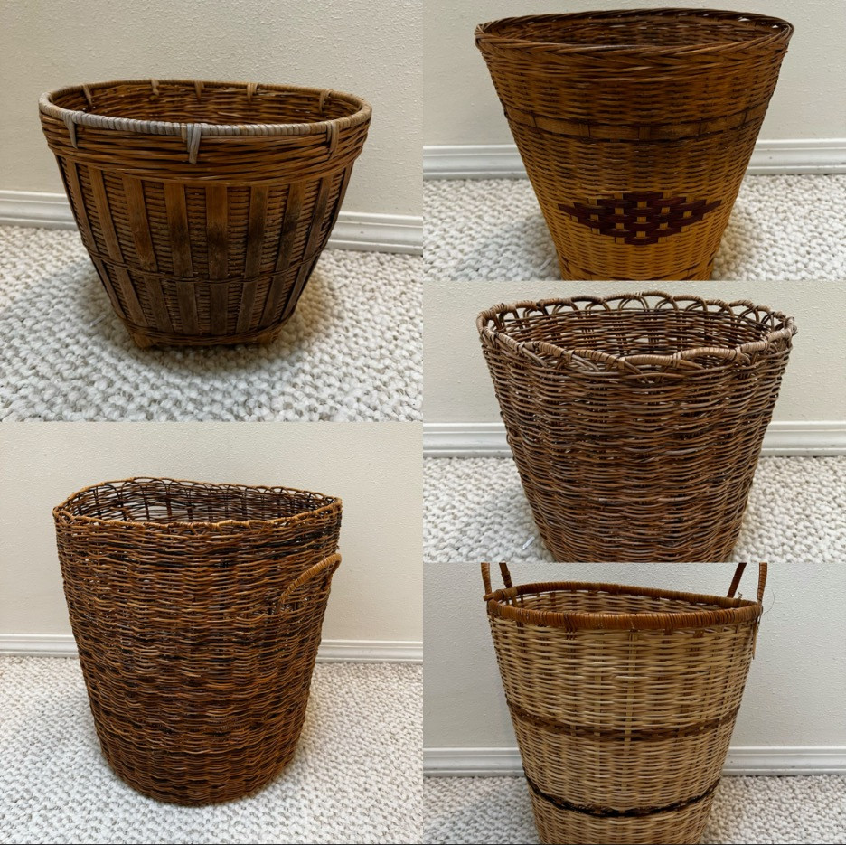 Smallest: 10 inches x 11 inches Largest: 17 inches x 17.5 inches Some baskets have fraying. Most handles are close to falling off.