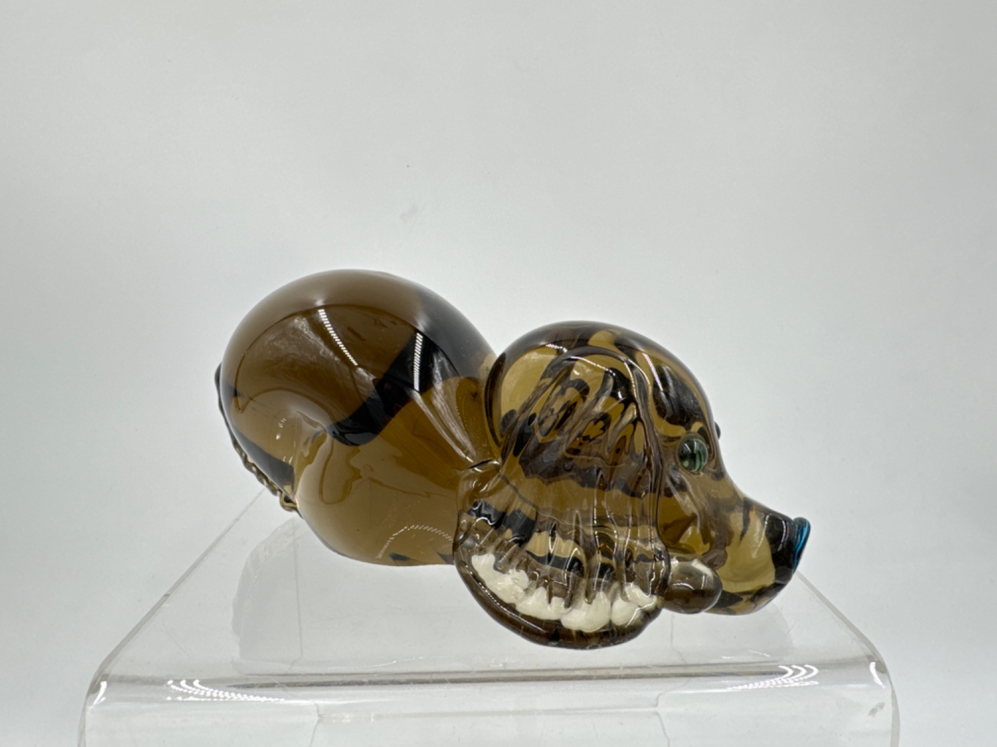 Mid Century SIGNED Seguso L Murano Art Glass Dog - 7.25"L Measures: 7.25"L x 3.75" at its widest. Signed on the bottom Smoked topaz/brown glass dog, eyes and nose are blue. Excellent condition.