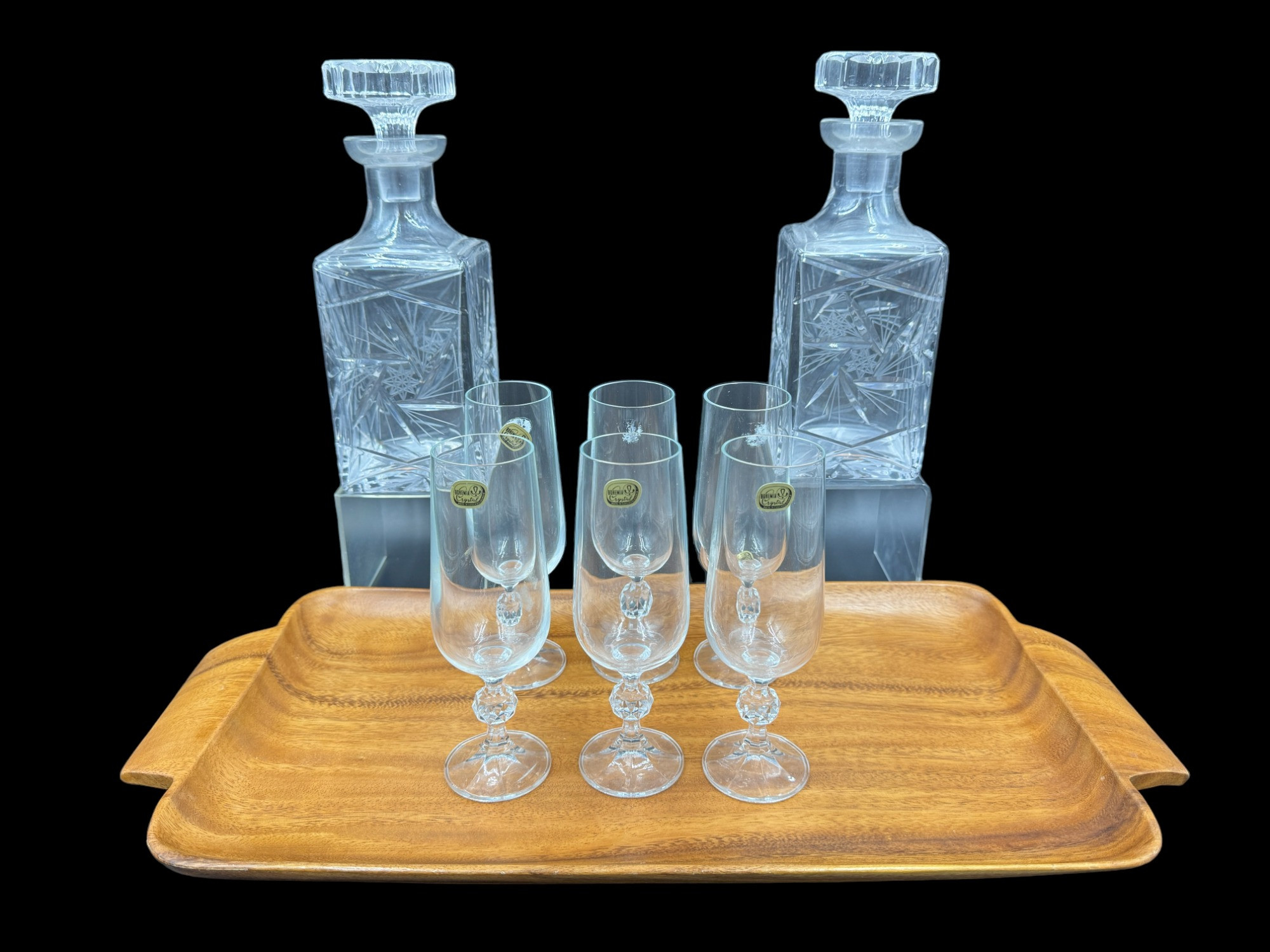 (6) Bohemia Czech Crystal flute glasses - 5 with stickers (2) Matching Whirling Star etched glass decanters - like new, appear unused - 10.25"T Monkey pod wood tray - 21"L