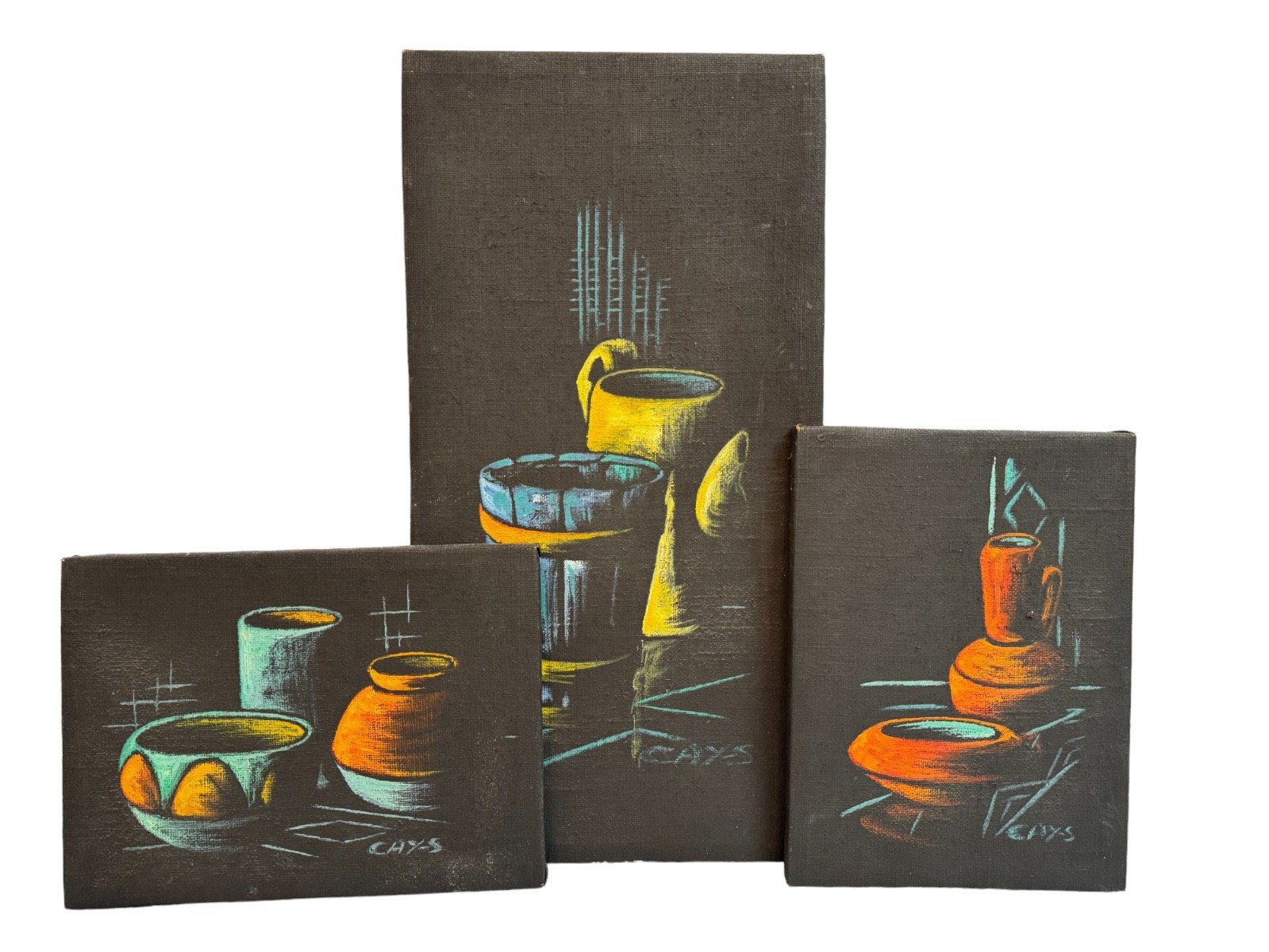 ORIGINAL Cay-Skot Mid Century Vessel Still Life Oil Paintings Signed Painted on burlap Largest painting is 24.75 x 12 5/8" (2) Smaller paintings are 13.75 x 10.25"