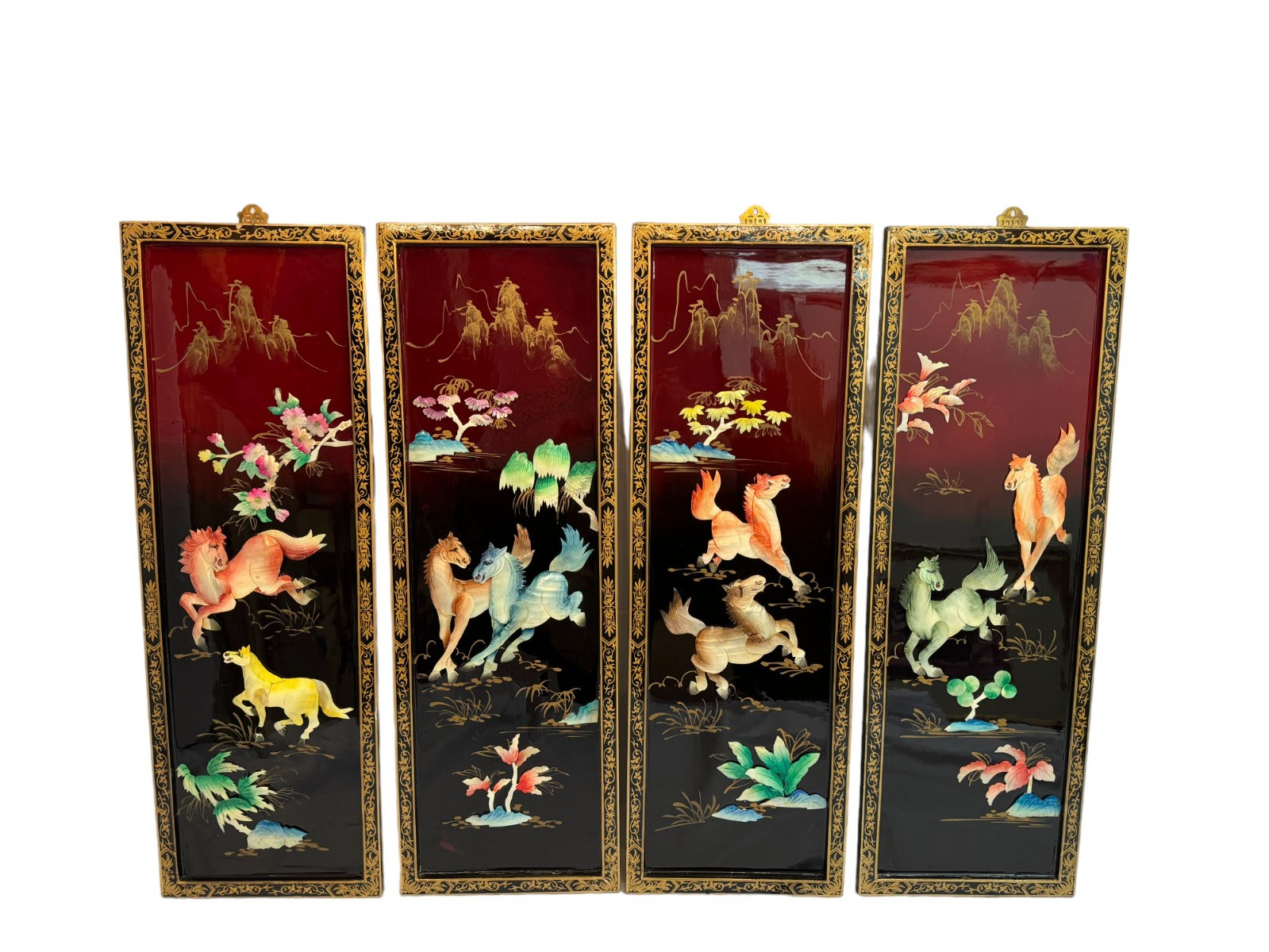 Vintage Asian Black & Red Lacquer Mother of Pearl Wall Panels All four panels have some sort of damage and/or repair. One of them is missing hanging hardware Frames measure 36 x 12"