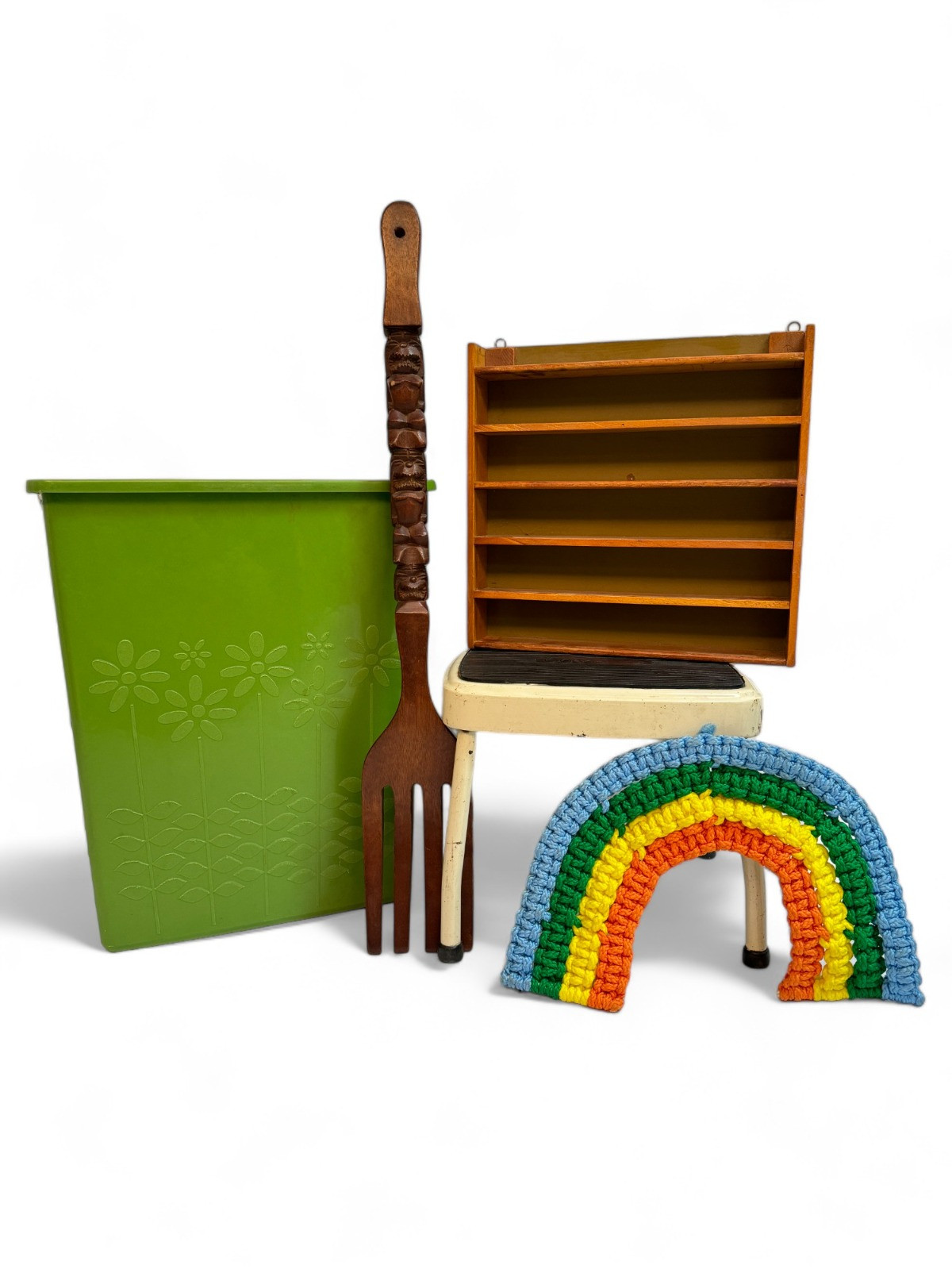 Retro Home Decor - MCM Tiki Fork, Macrame, Cosco Stool Green Daisy Esco 8875-A hamper - missing top, good trash can. Metal Costco step stool - wear to rubber finish on top. MCM Tiki fork wall decor - 28"T - has chip Macramé rainbow 1940 small tray shelf measures 13.5 x 13 1/8" not including hanging hardware - has nail hole in the back, damage to some of the wood shelves.