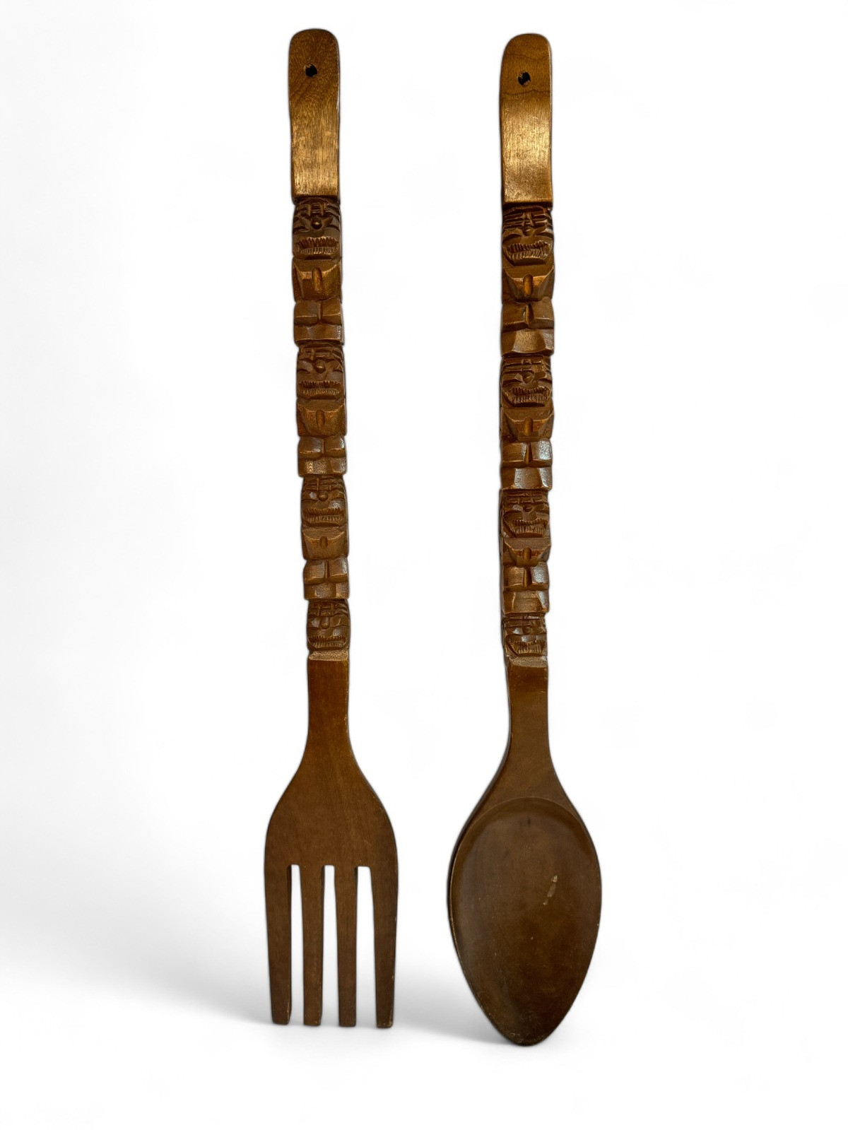 Vintage Large Tiki Spoon & Fork Wall Hanging Kitchen Decor 36 inches tall Minimal wear to wood, scuff on the spoon front and side of fork
