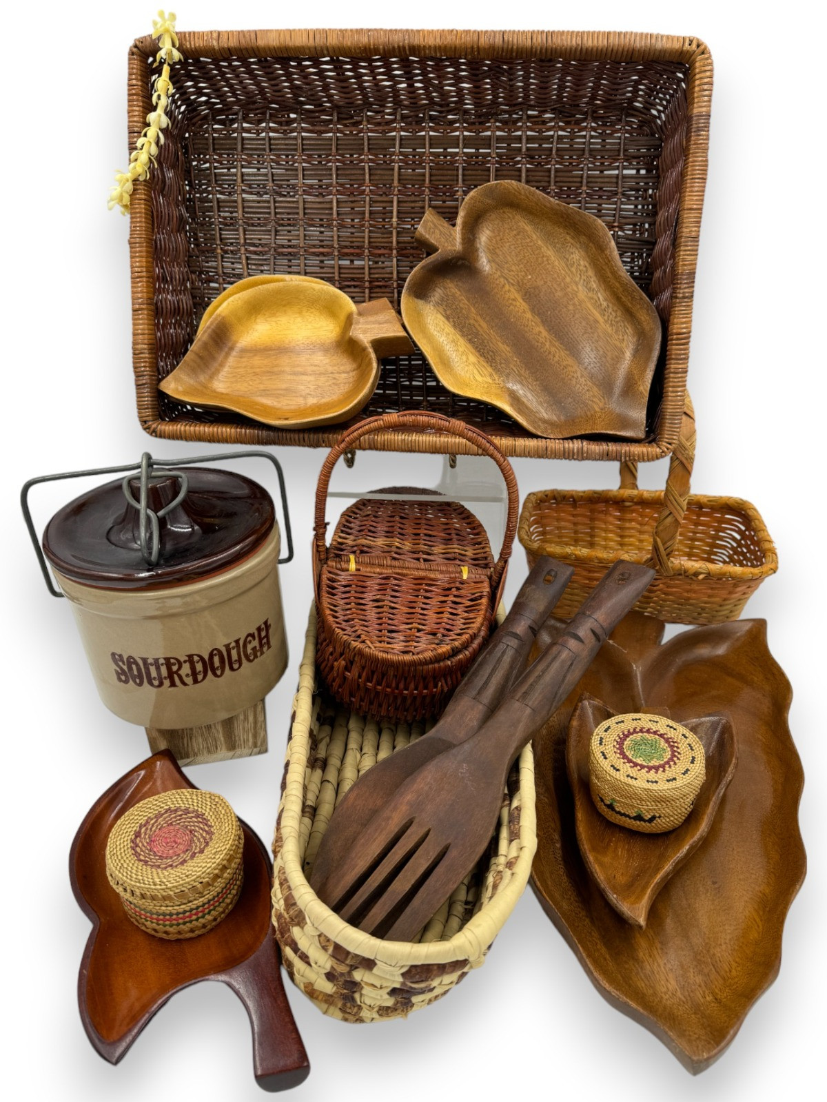 Mid Mod Monkey Pod Wood, Baskets, & Sourdough Starter Canister Mix of woven baskets and Monkey pod wood. Haitian Mahogany tray measures 9.75"L Largest monkey wood pod tray - taro root leaf 15 inches long Stoneware sourdough starter canister