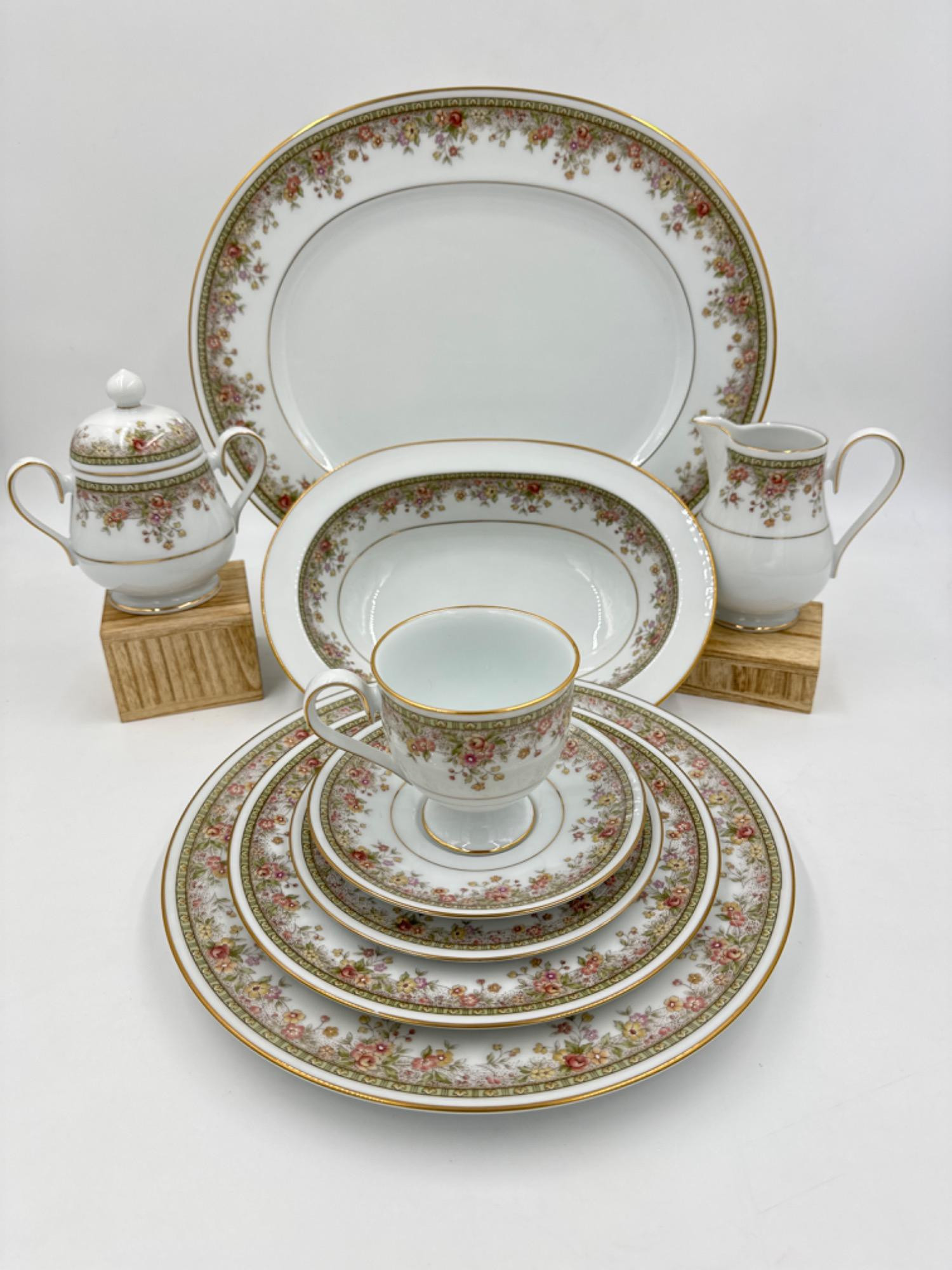 Vintage Noritake China Ireland Morning Jewel 16 Place Settings + 16 cups and 16 saucers 16 dinner plates 16 salad plates - 8 1/8"D 16 bread plates - 6 1/8"D Cream and sugar. 10" oval bowl 13.5" platter Set in excellent condition. Only one of the salad plates has slight wear to the gold room rim.
