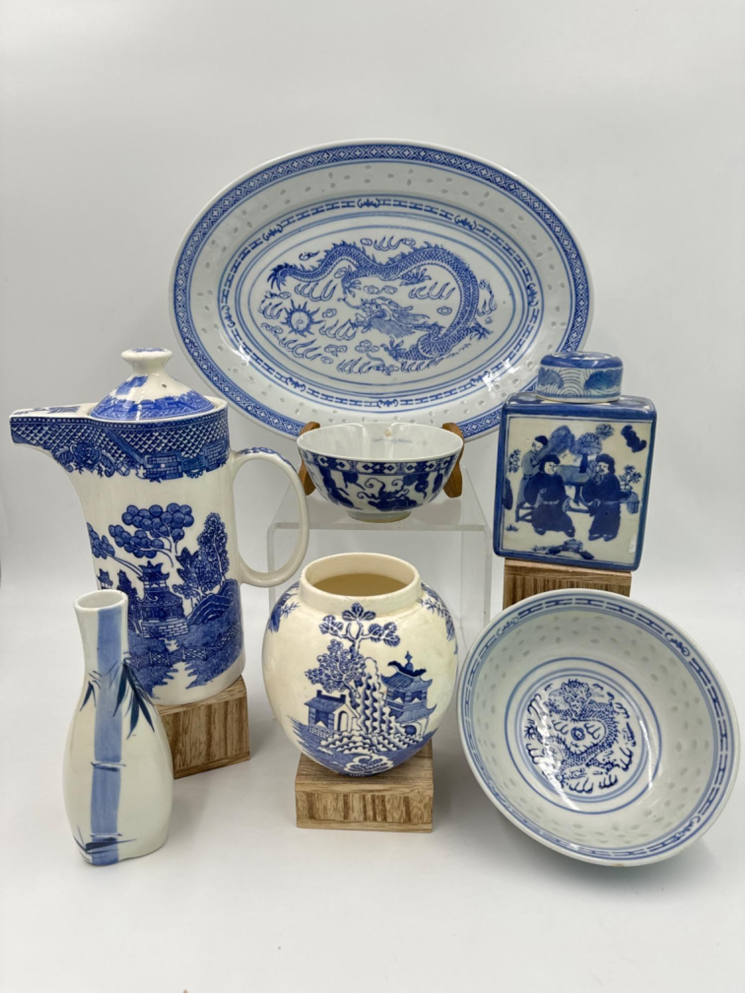 Vintage Blue & Ceramics - Willow Print - Rice Grain Porcelain Includes: Mason’s for Twinings Ceramic tea jar - missing lid. (2) matching Rice porcelain - unique as the rice allows light to shine through. Vintage Blue Willow teapot teapot - 8.5"T - has crazing on lid Platter is 12 inches Smallest piece is 2 inches tall.