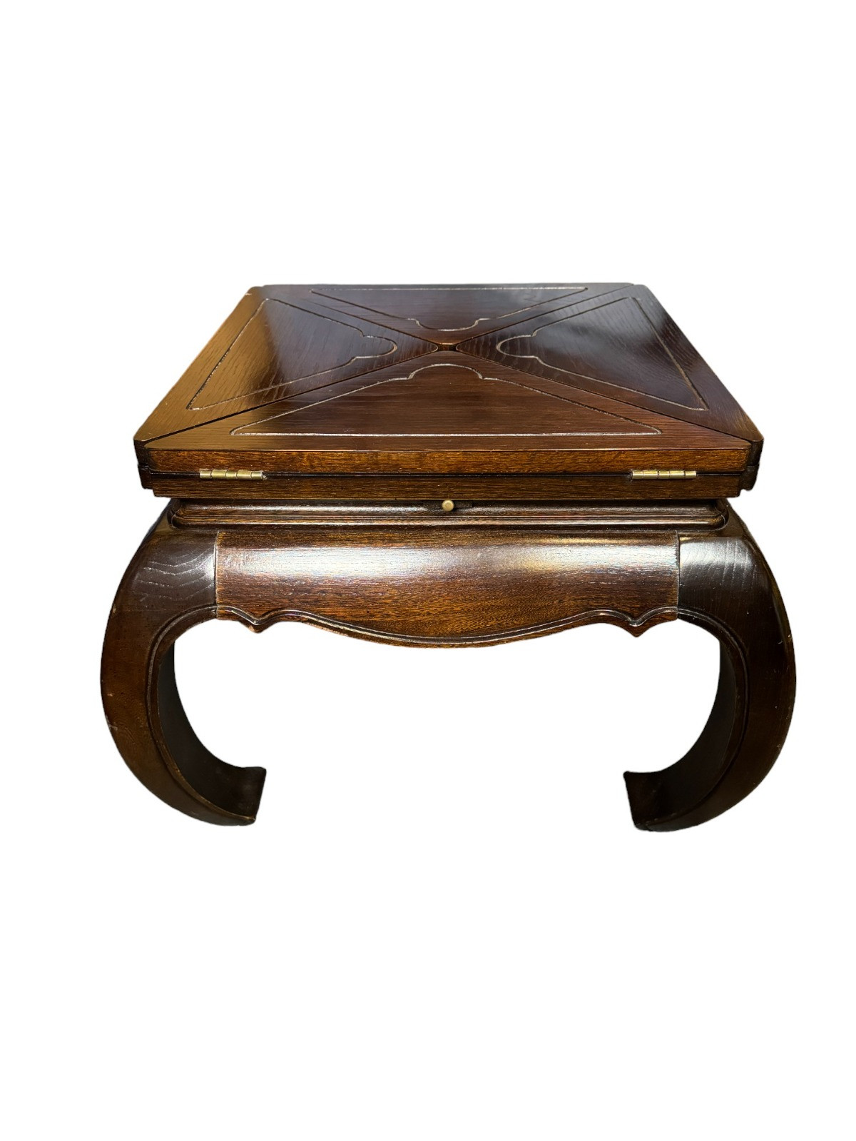 Vintage Ming Style Side Table w/ Expanding Fold Out Top Solid wood with beautiful veneer Measures: 16 inches tall by 21.5 inches wide - when table is expanded 25” x 25” top. Excellent condition