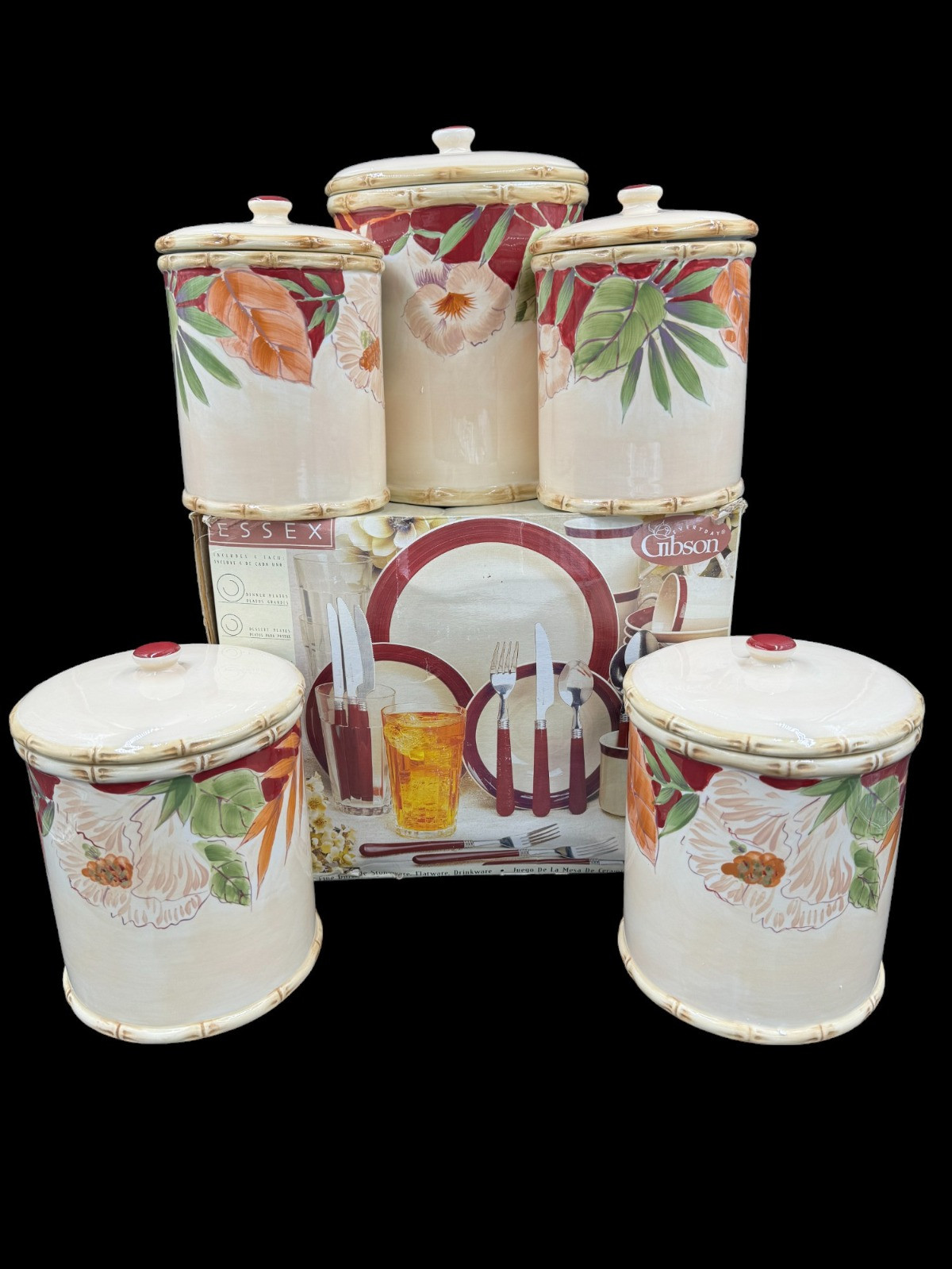 Like new vintage Gibson Hibiscus II Canisters & Burgundy Essex Dining Set Essex Burgundy 31 piece dining set - open but unused. Hibiscus II ceramic canisters. New in box. One complete set of 3 canisters. Second set the large canisters is missing. Canisters measure: 7" - 9.25"T