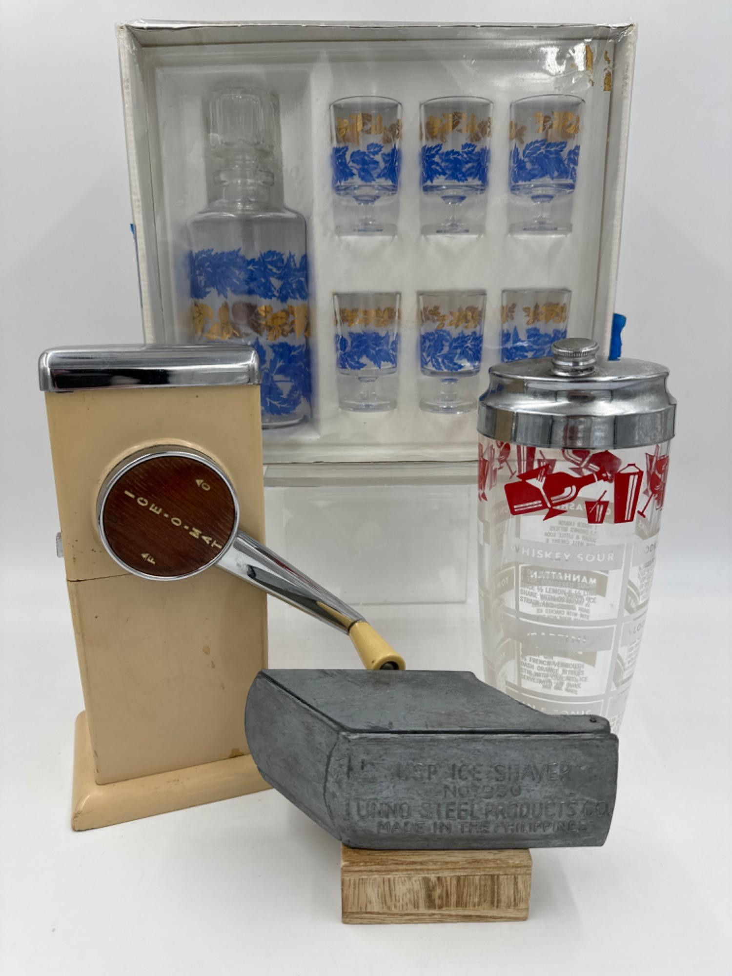 French made Luminarc Blue & Gold Decanter Set with original box. Ice-o-mat - Heavy metal top construction, base is plastic - needs cleaning. Vintage aluminum ice shaver - there is noted cracking on the hinge area Glass cocktail shaker - 9.5"T to spout