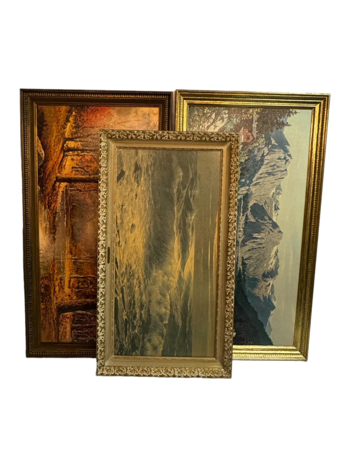 Robert Wood Autumn Landscape print - Frame measures: 28 x 52.25" (2) Amadeo Baroni framed prints Spring Lake - Frame measures: 48" x 29" Illinois Molding Breakers at Eventide - Frame measures: 45.5" x 25.5" x 3“ All are pressed wood frames and in good condition