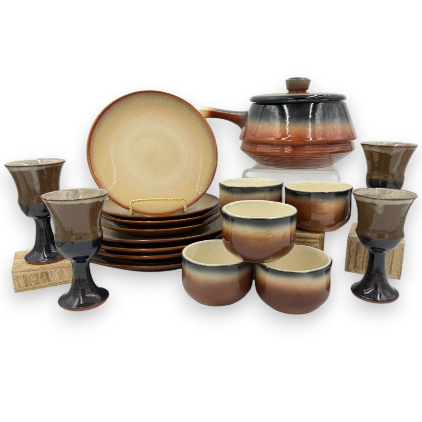 Esmond USA 16 Glazed handled ovenware pot w/ (5) matching personal bowl SANGo Nova Brown 4933 plates: (4) 8" salad plates & (3) 11.25" dinner plates Brown and blue pottery chalices. All are in good condition with the exception of one chalice - chip on rim