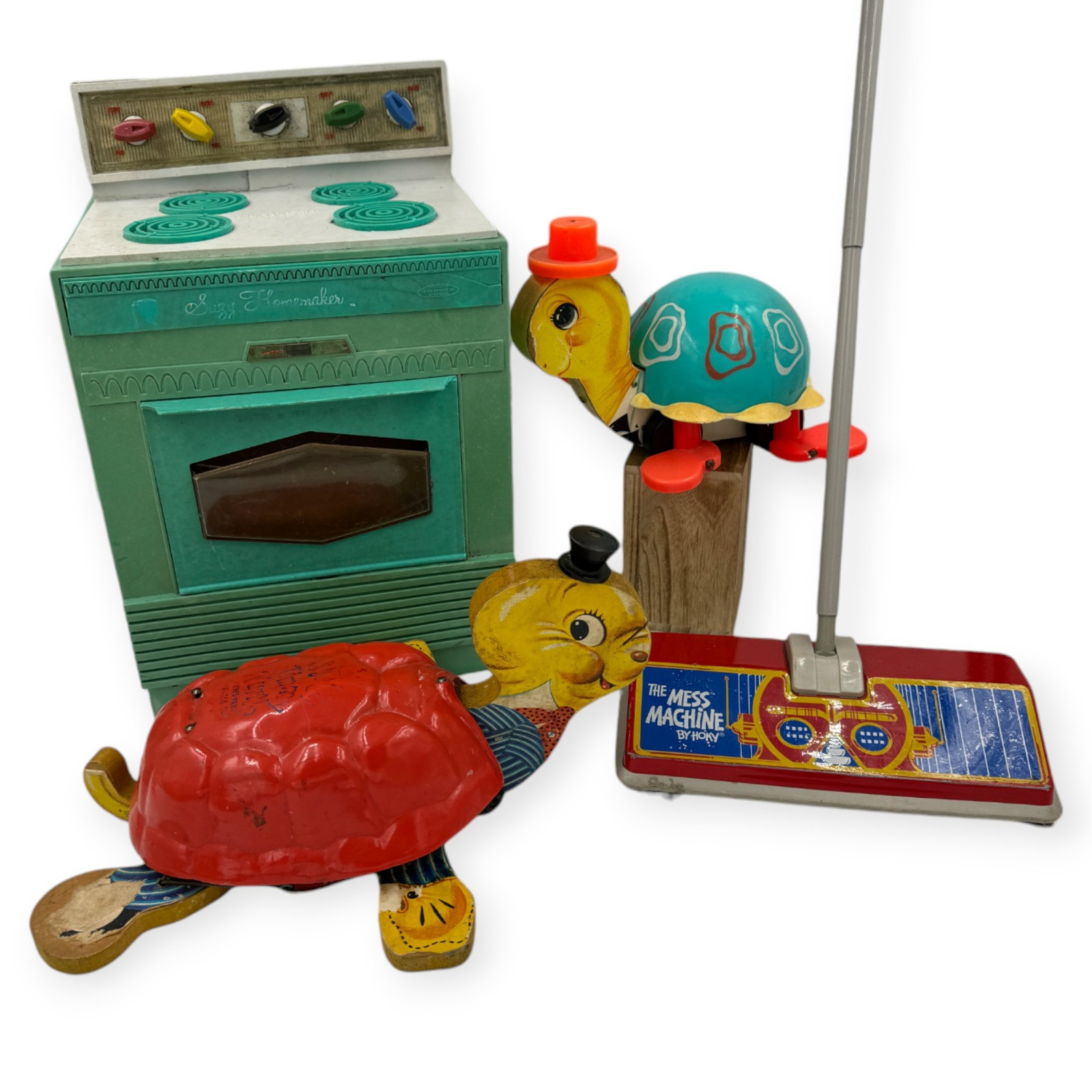 Mid Century Kids Toys (2) Fisher Price Pull Along Turtles - well loved 1968 Suzy Homemaker oven - plastic is cracked, was not brave enough to plug this in and test it The Mess Machine by Hoky