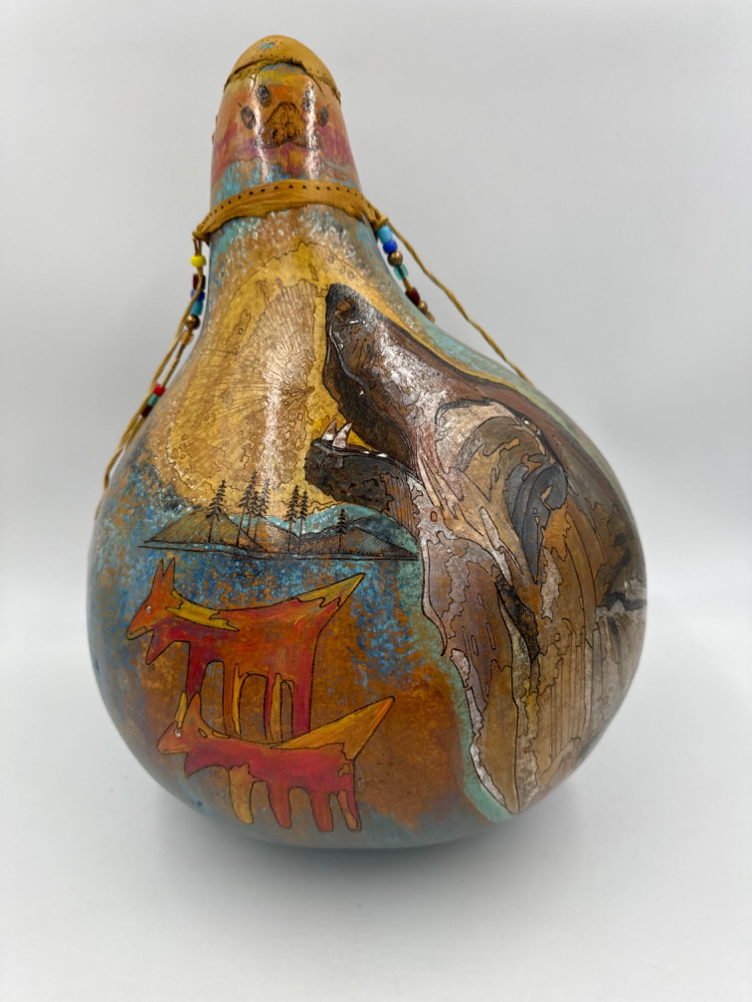 Coeur D'Alene Rez Wolf Pals Gourd Art - Signed 'brian' - 15"T Measure 15 inches tall x 12 inch diameter Glass and brass beads with leather detail Great condition