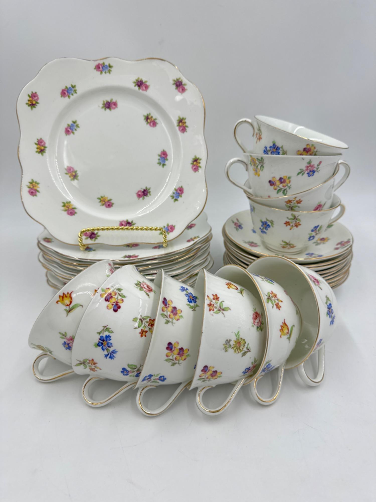 Vintage M&R Floral China Luncheon Set - 10 Place Settings One cup has hairline crack Minor rough spots on the rim of the plates, hard to tell as the previous owner used gold paint to cover imperfections. Overall great set with not chips.
