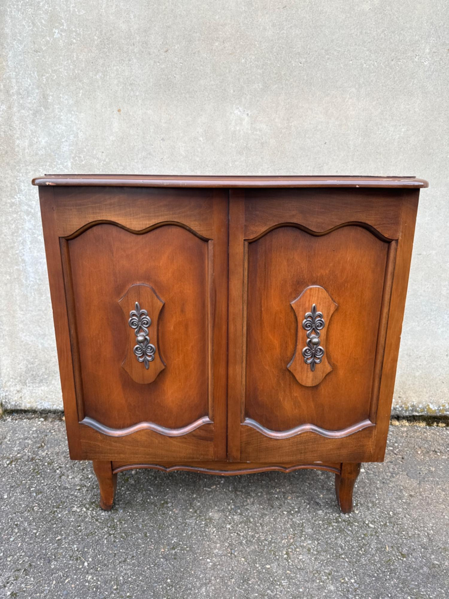 Vintage Hi-Hat Line Vinyl Record Cabinet w/Cherry Wood Finish Structurally excellent as most of it is solid wood. Scuff on top and side edges, deep scrape on top. Measures 27.5"W x 16"D x 29"T