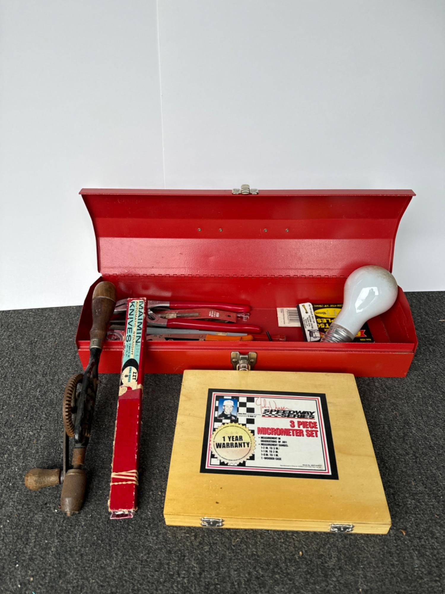 Lot # 182 - 3pc Micrometer Set, Red Tool Box w/Tools & More
