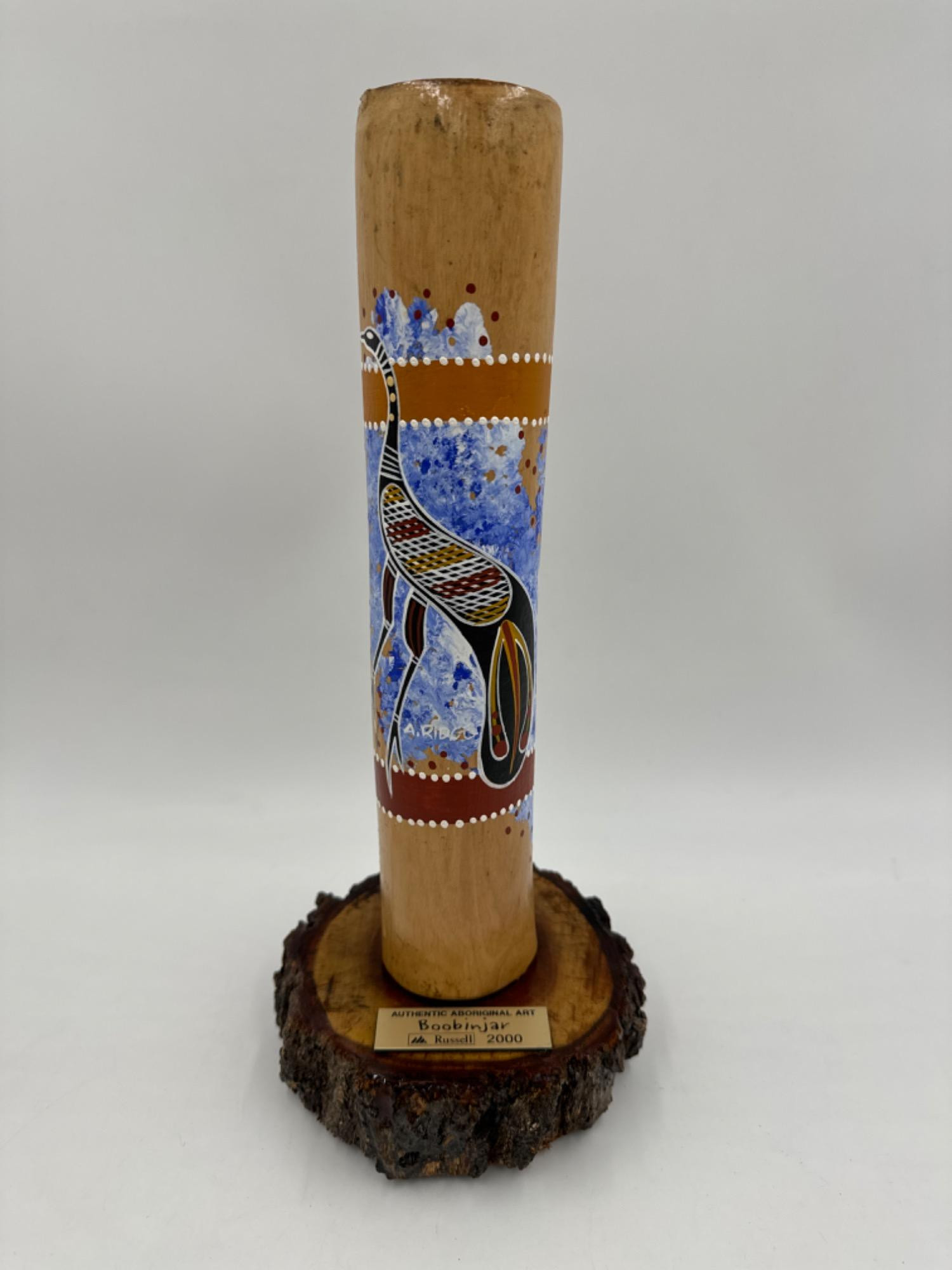 Authentic Australian Aboriginal Art Possibly mini didgeridoo? Art itself is 11.5"T. It is 14" on the stand Signed by artist A. Ridge.