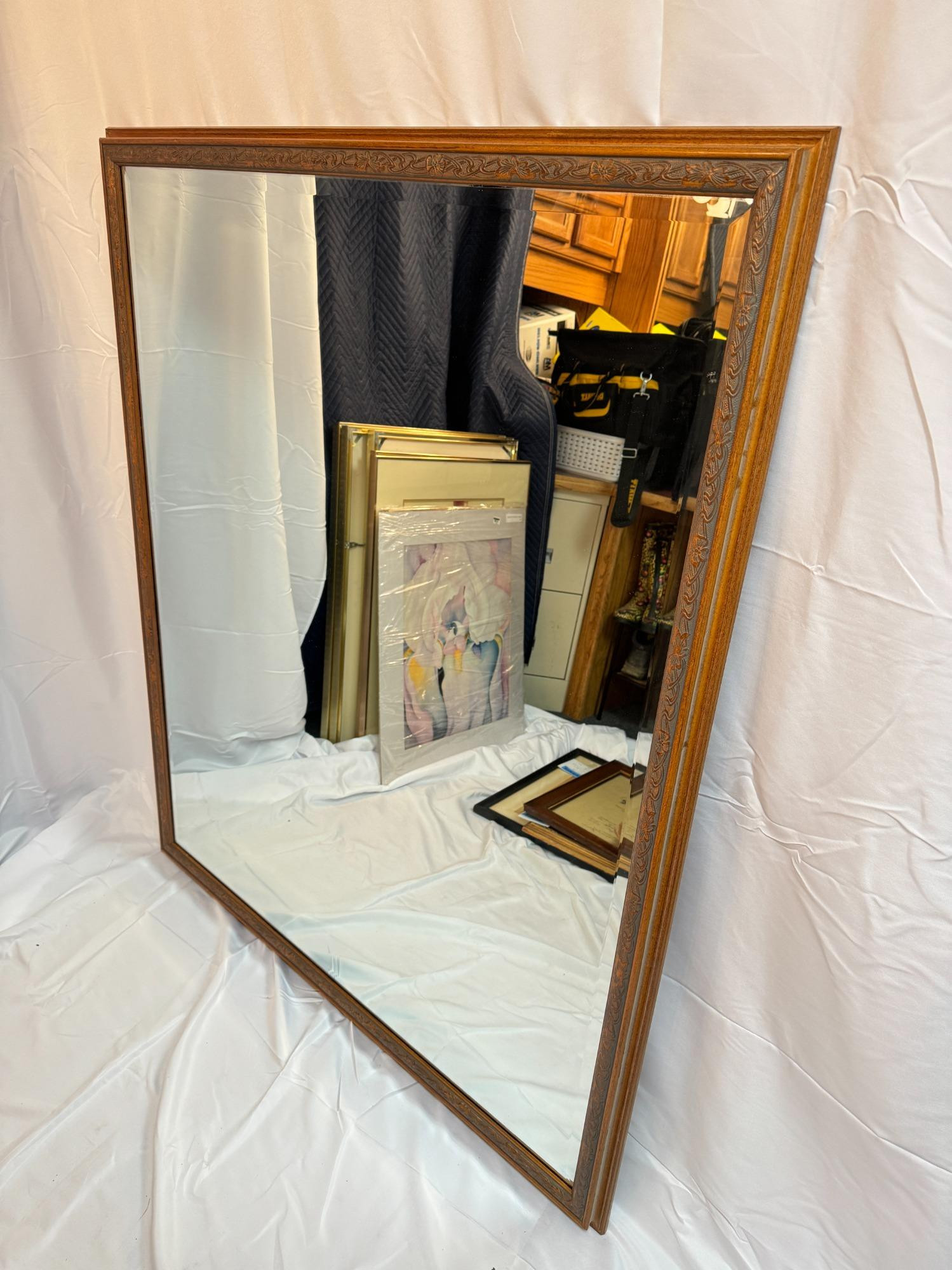 HUGE Wood Framed Bevelled Mirror Has Floral Pressed Design One corner has chip. Currently set up to be hung landscape. Frame measures: 51.5" x 43.5"