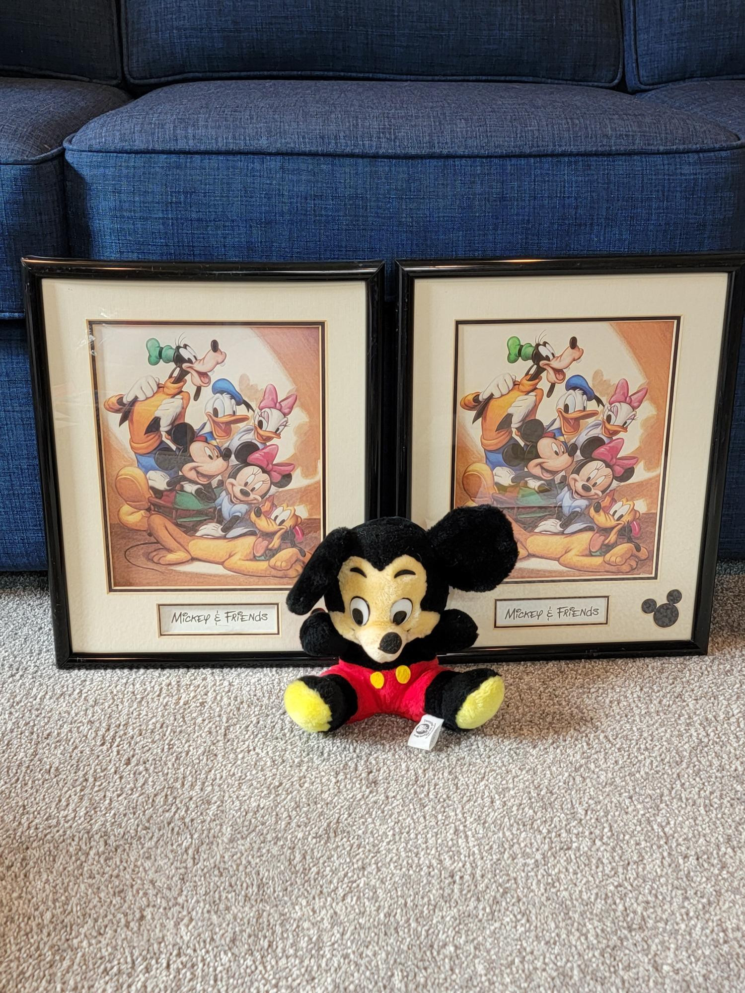 Vintage Framed Mickey Posters & Walt Disney Mickey Each picture measures 12"W x 15"T x 1"D; one picture is missing the paper backing Mickey measures about 8"T and is in great condition
