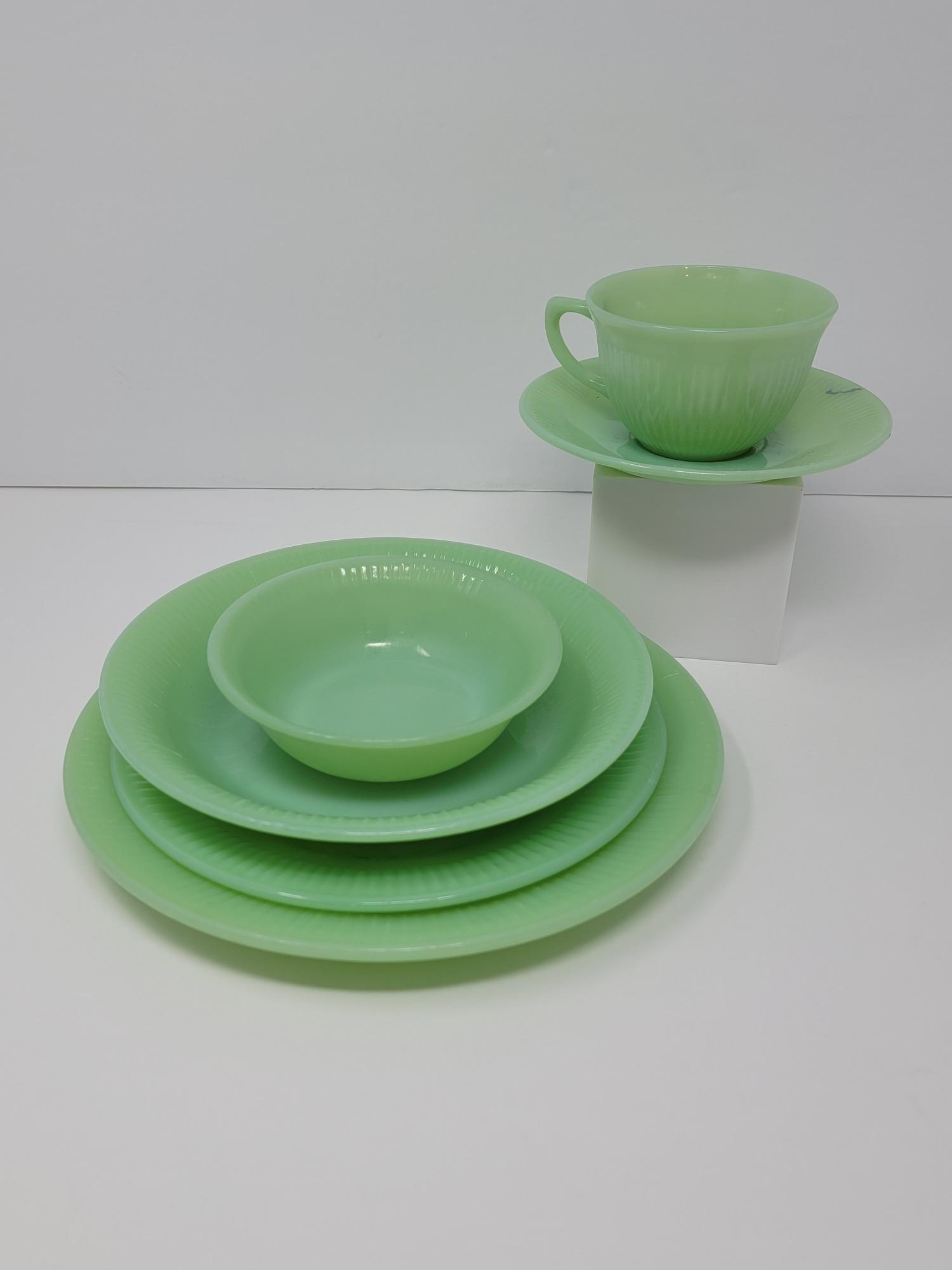 Jadeite Fire King Jane Ray Set Includes: dinner plate (9" across), salad plate (7 3/4" across), soup bowl (7.5" x 1.25"), berry bowl (5" x 1.5"), cup (3.75" x 2.5") and saucer (5.75") 6 pieces total