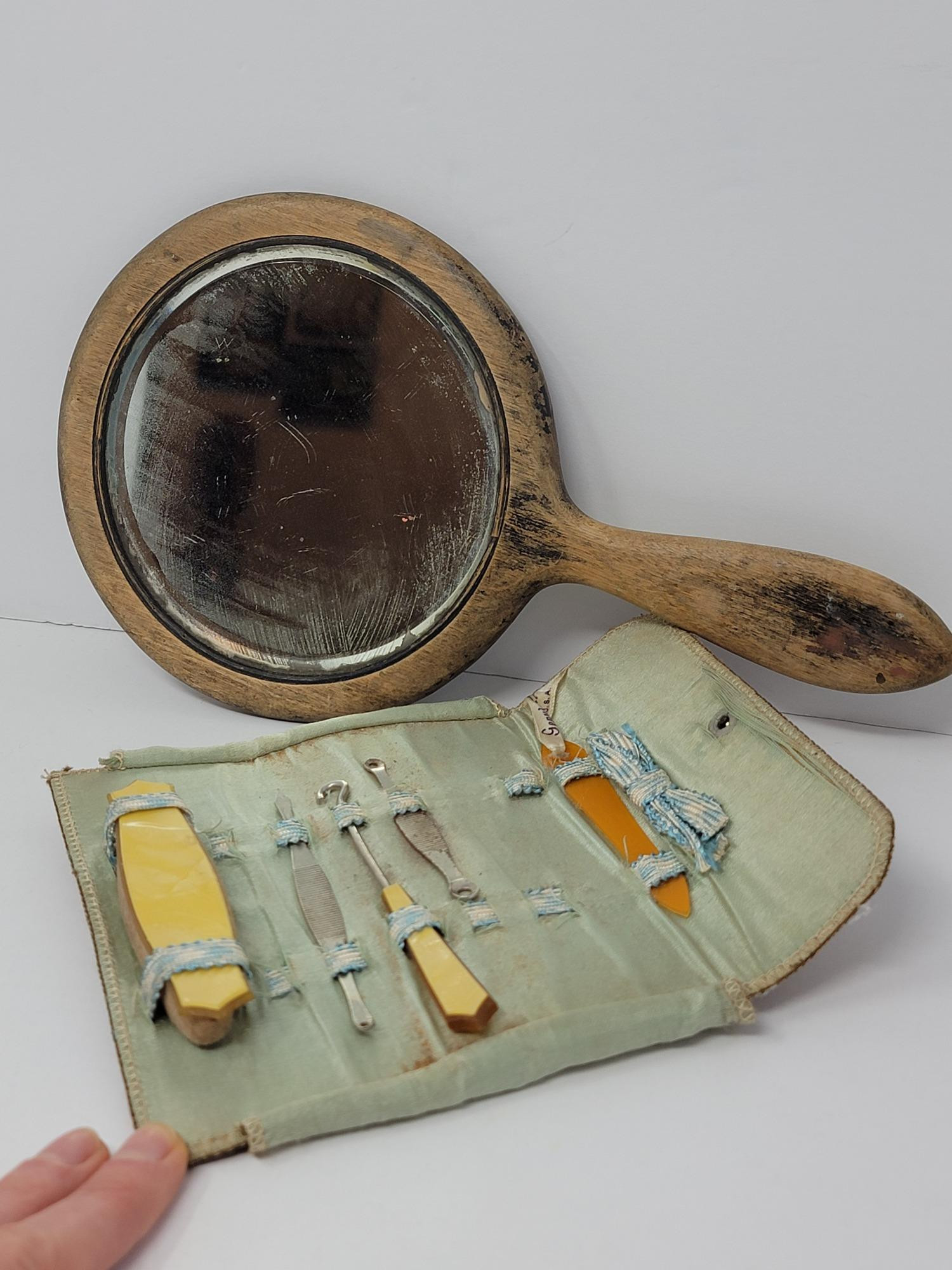 Antique Wood Handled Mirror & Manicure Set Mirror- 10.5" x 6" Manicure case 6" x 2"