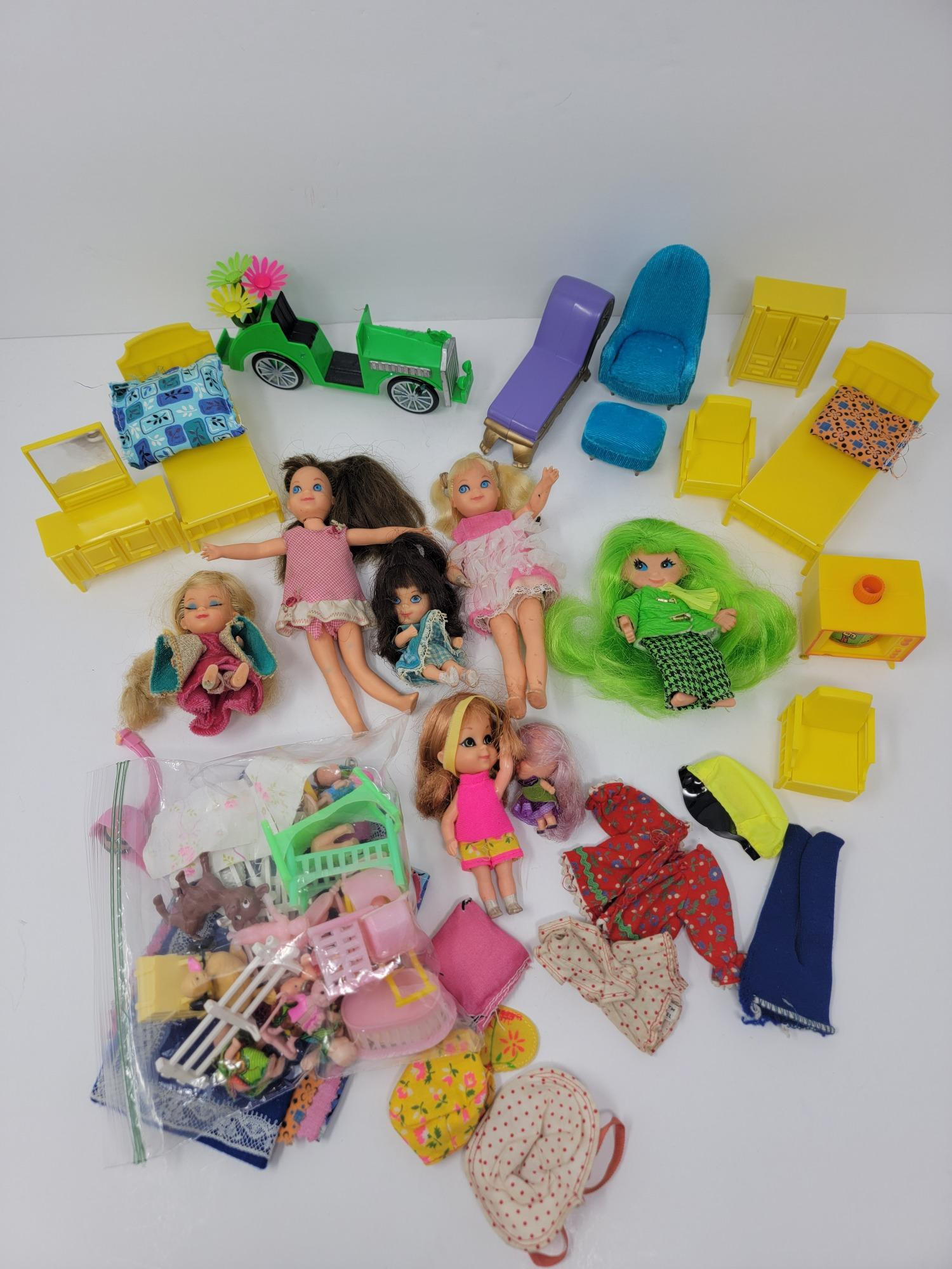 An Assortment of Vintage Dolls, Clothes & Furniture Smallest doll is about 2" largest doll is about 6"