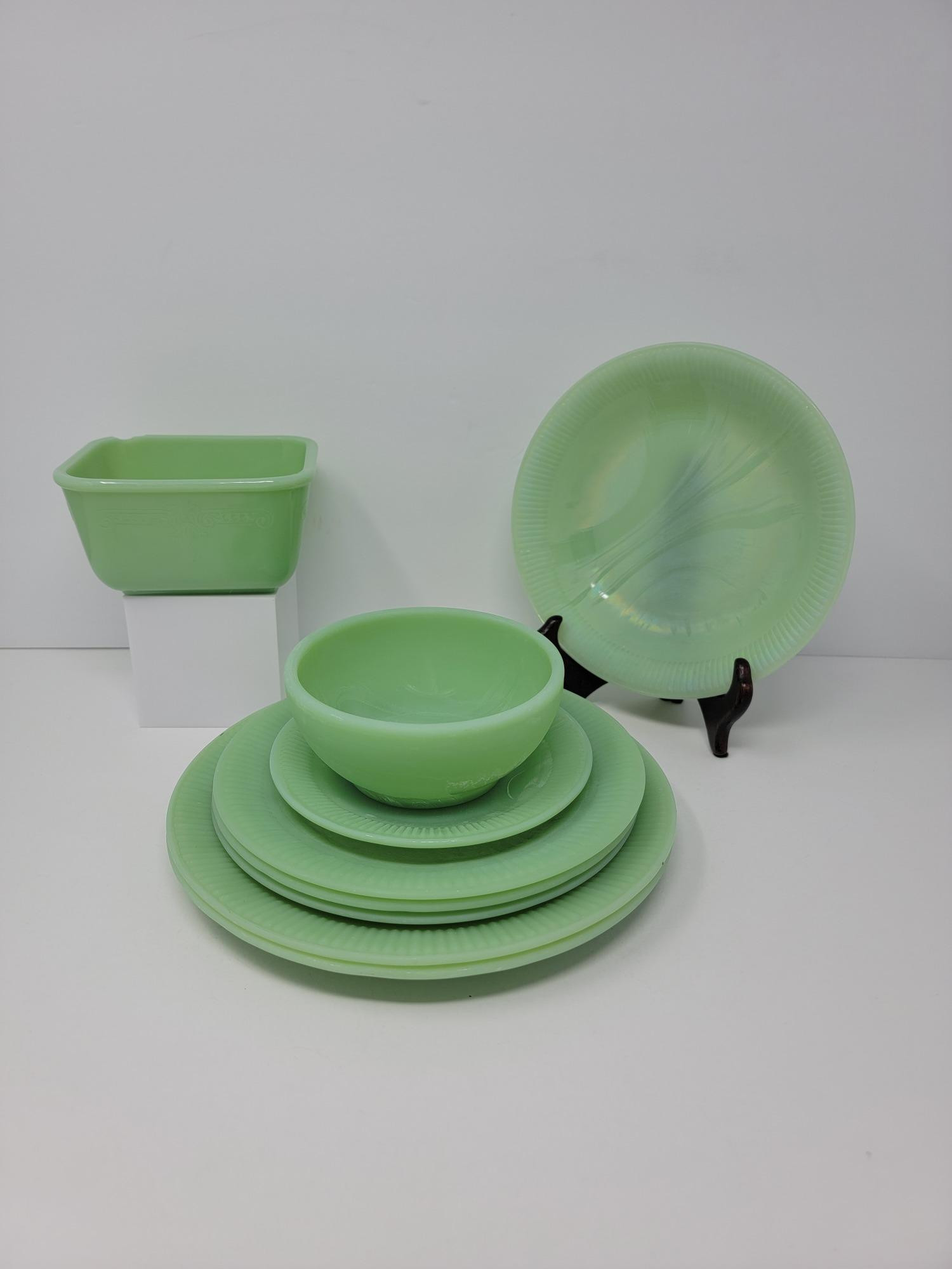Jadeite Dishes with Imperfections 9 pieces total; have lost their luster Two dinner plates 9" across 3 salad plates 7.75" across 1 bread plate 6" across chili bowl 5" x 2" soup bowl 7.5" x 2" refrigerator dish has chip see pic 5" x 4.5" x 2.5"