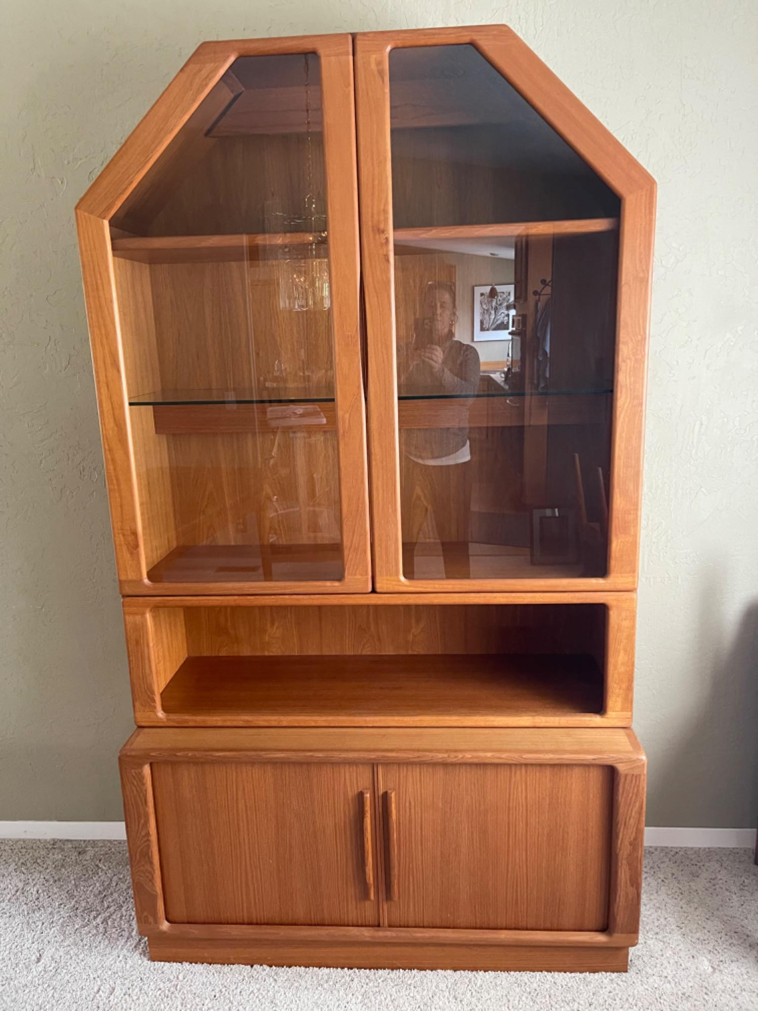 Mid-Century Teak Danish Hutch with Glass Doors 2 glass doors and 3 shelves inside, open mid-section, and 2 bottom doors with 1 shelf each inside. Hutch measures - 47 W x 19.5 D x 81 T Could not find manufacturer but believe it to be same as dining room table and chairs.