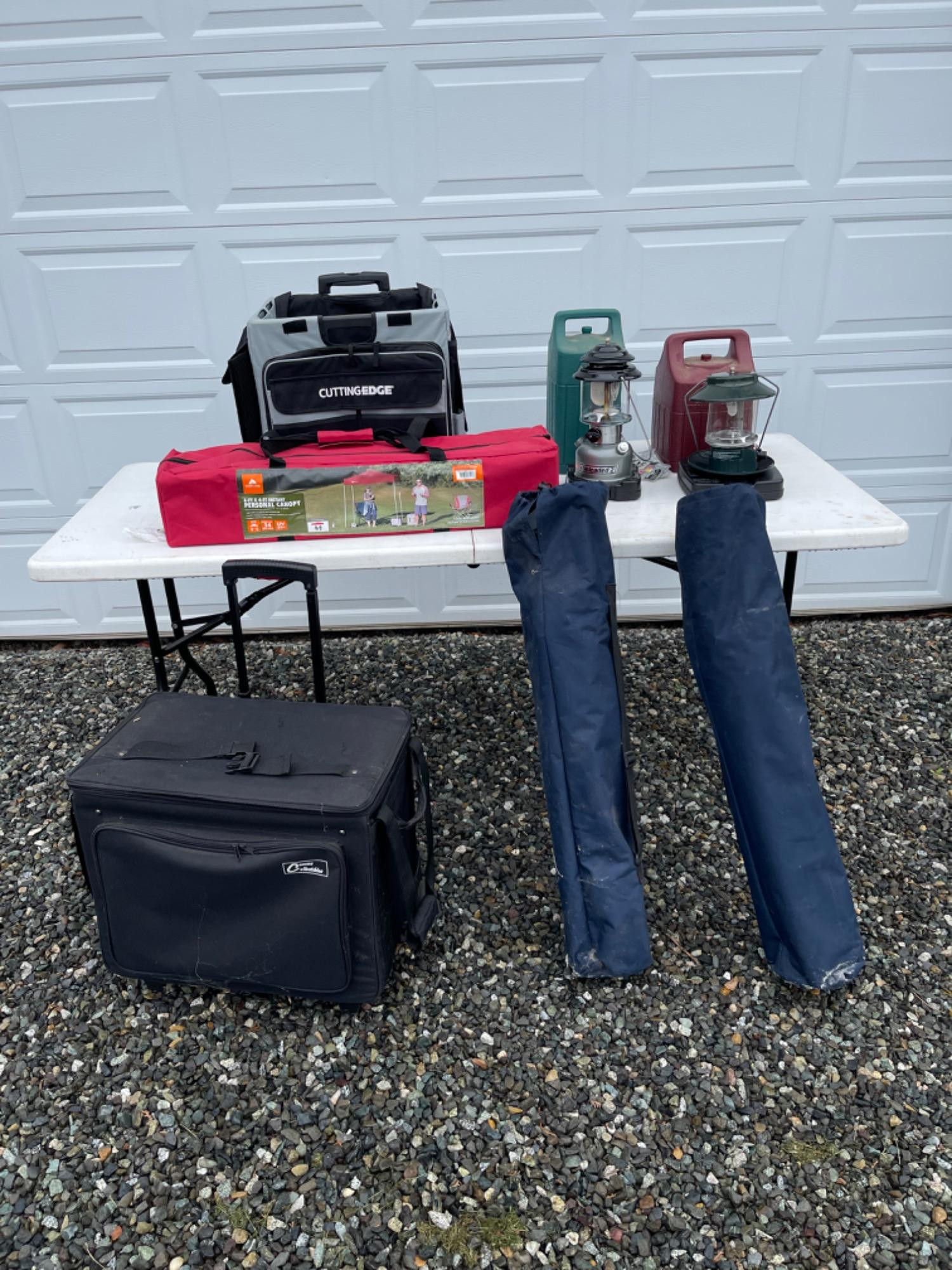 This lot has two camp chair/foldable, two propane lanterns, one small tent, two carry totes.