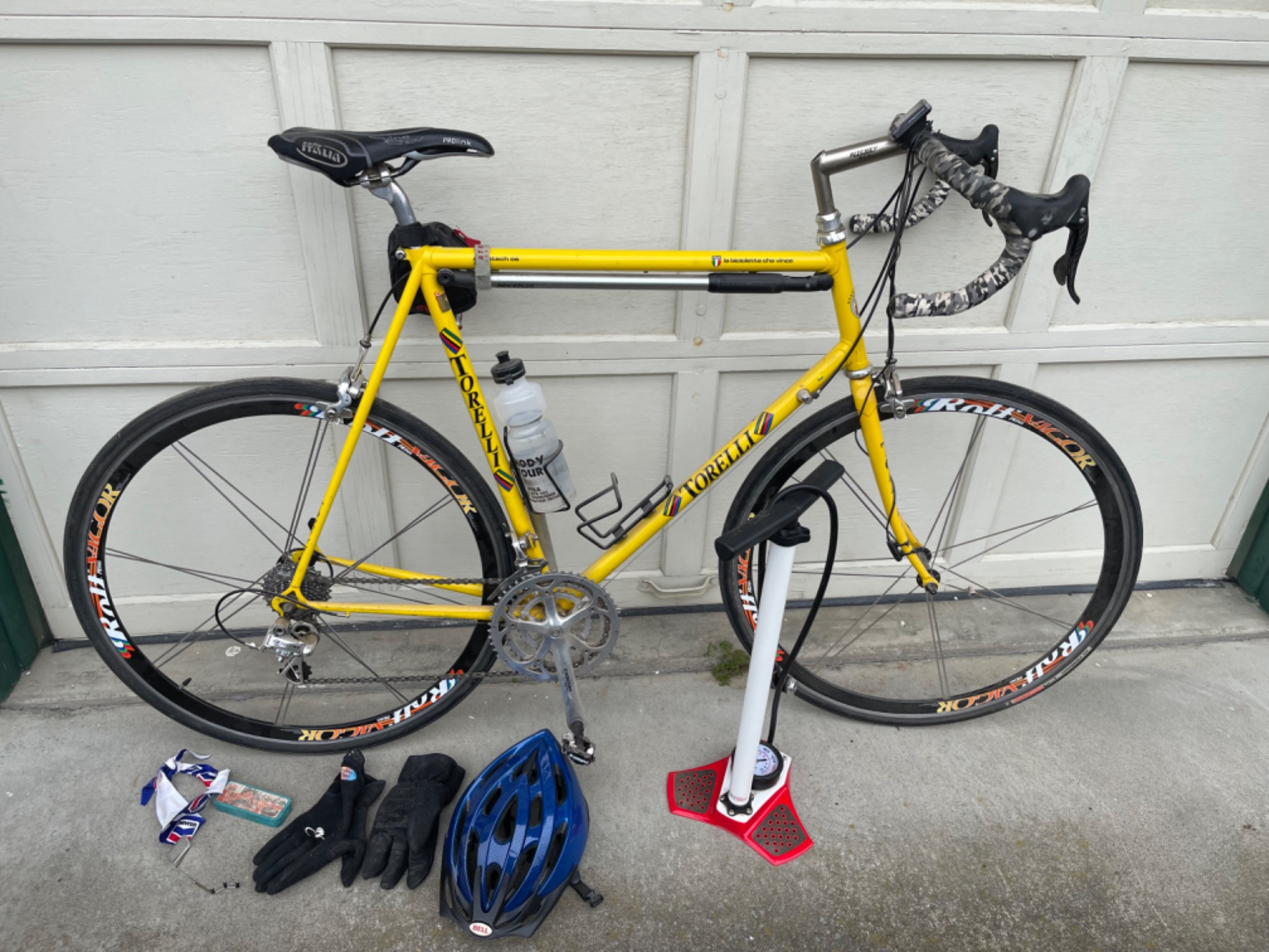 Frame: Torelli Countach OS (frame measure 34" from top of frame to ground. Drivetrain: Campagnolo Racing T triple crankset Wheelset: Mavic Kyserium Saddle: Selle Italia Prolink I believe the bike was Orinda Pedal and Spoke in 1999. This bike fits a 6' man. axel to axel 40"