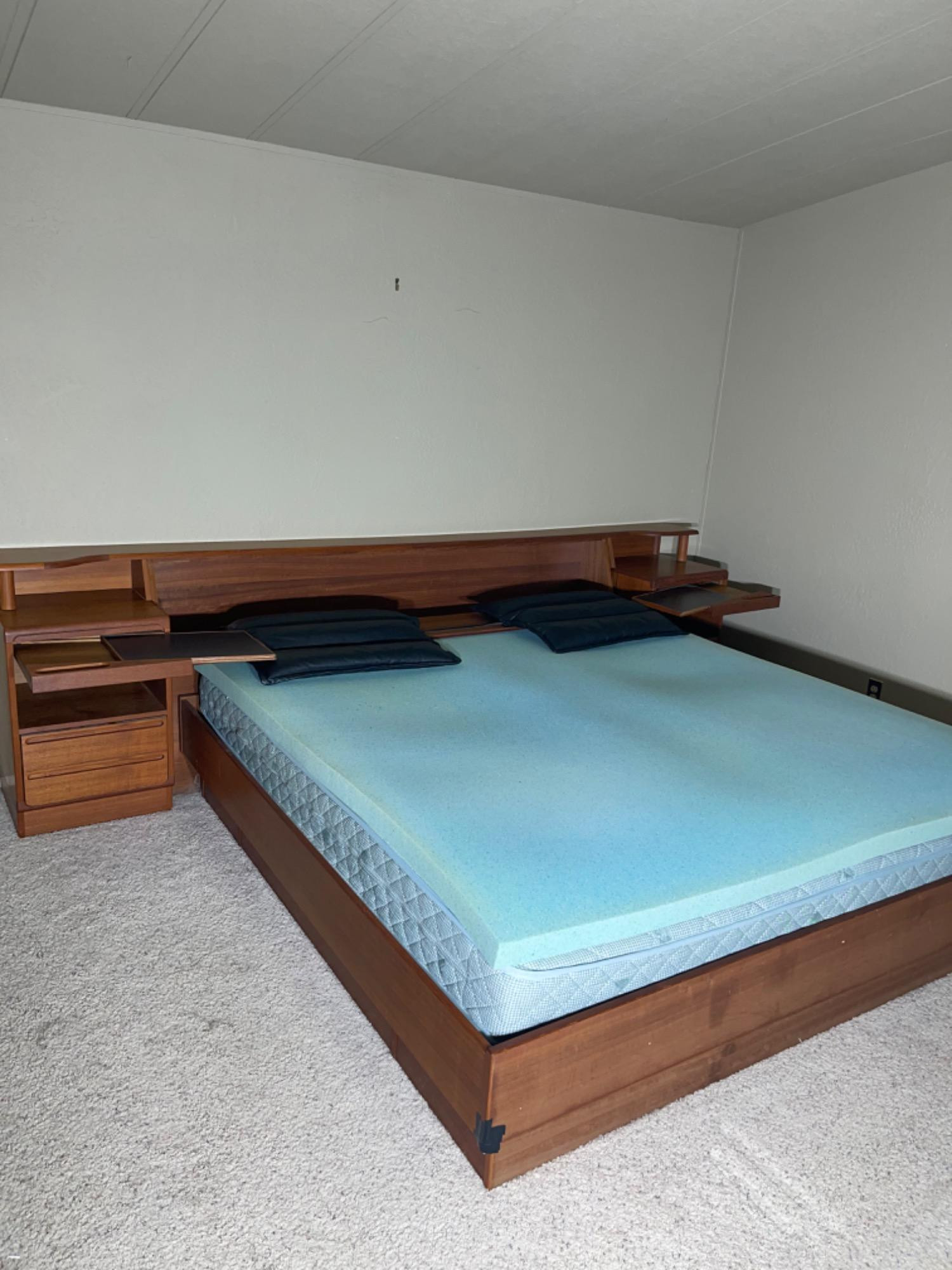 "breakfast in bed" tray. Trays are very sturdy and can be used for holding drinks, reading material, a laptop, etc. All drawers feature dovetail joinery with the headboard having a large storage compartment built in at the top where two black headrest pillows were added. One corner of the bed has black tape covering it, overall in good condition. Overall Measurements - 122" W, 28.5" H, 93" D Bed - 82" D, 80" W, 14" H Nightstands - 19.5" W, 18.5" D, 28.5" H Headboard - 83" W, 10" D, 28.8" H headboard detaches from frame where mattress is.