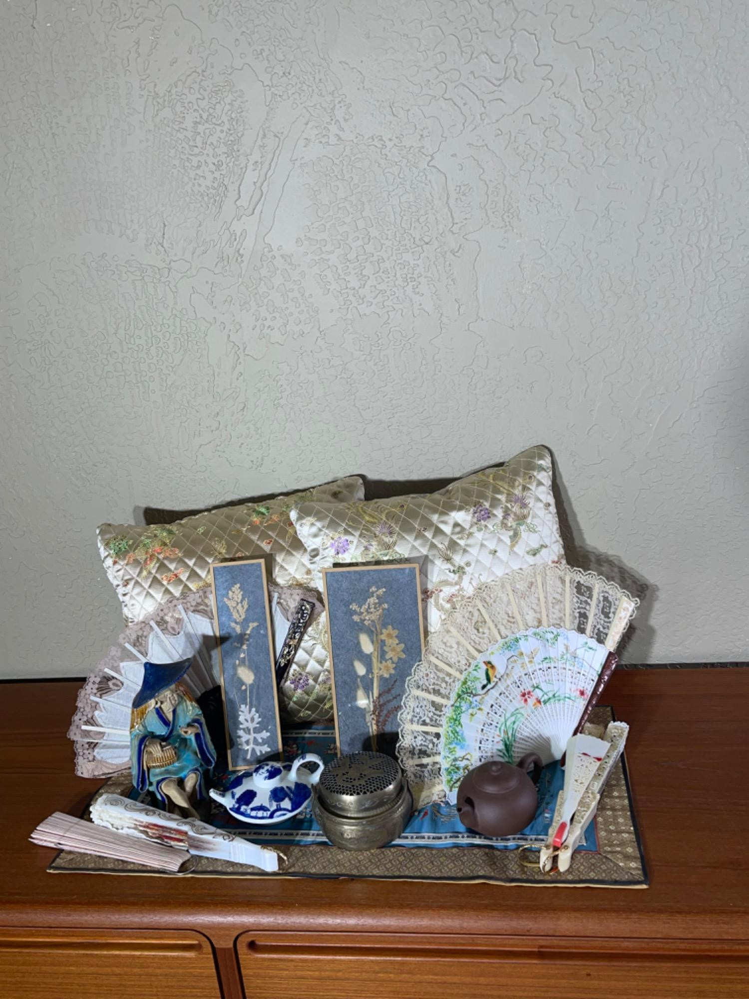 Lot # 60 - Silk Pillows, Fans, Pottery Mudman and More