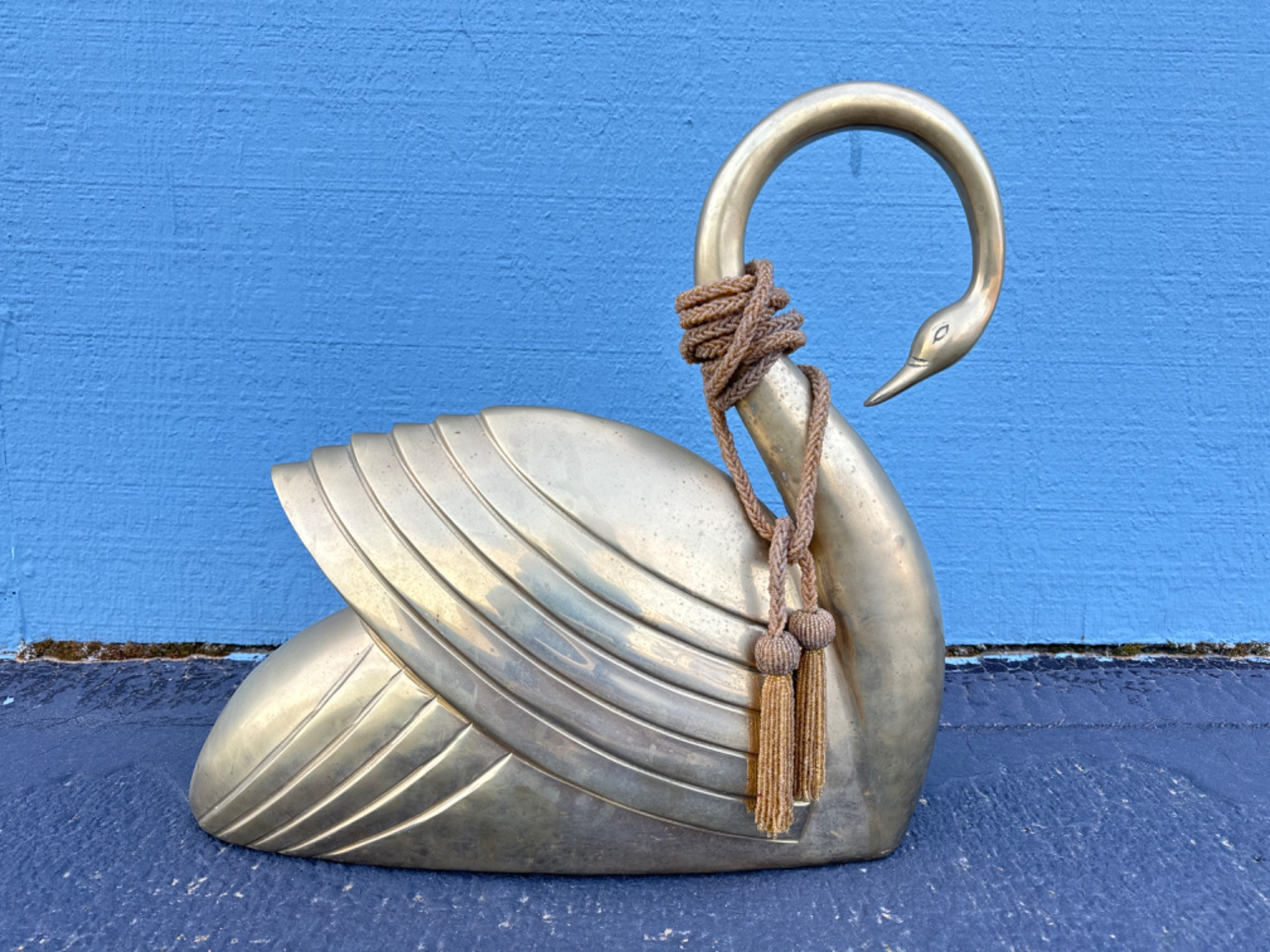 1985 Dolbi Cashier Hollow Cast Art Deco Brass Swan Heavy Measures: 18.5"T x 19"L x 5"W Has green patina around neck, bead rope covers