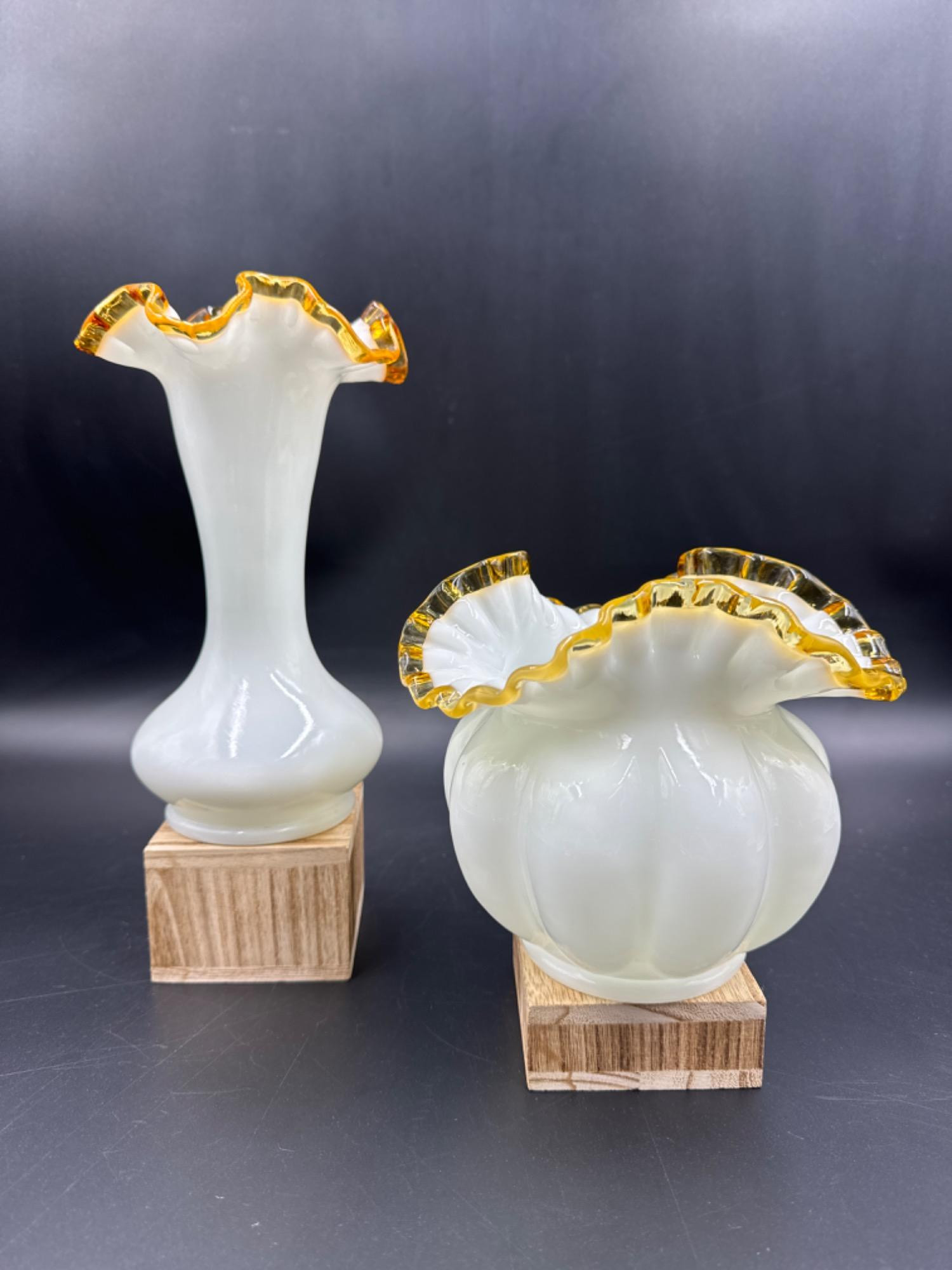 Vintage Fenton Gold Amber Crest Milk Glass Vase & Rose Bowl Both have a Ruffled Crimped Edge 8.25" & 5.5" Both in great condition, free of nicks, chips, or cracks