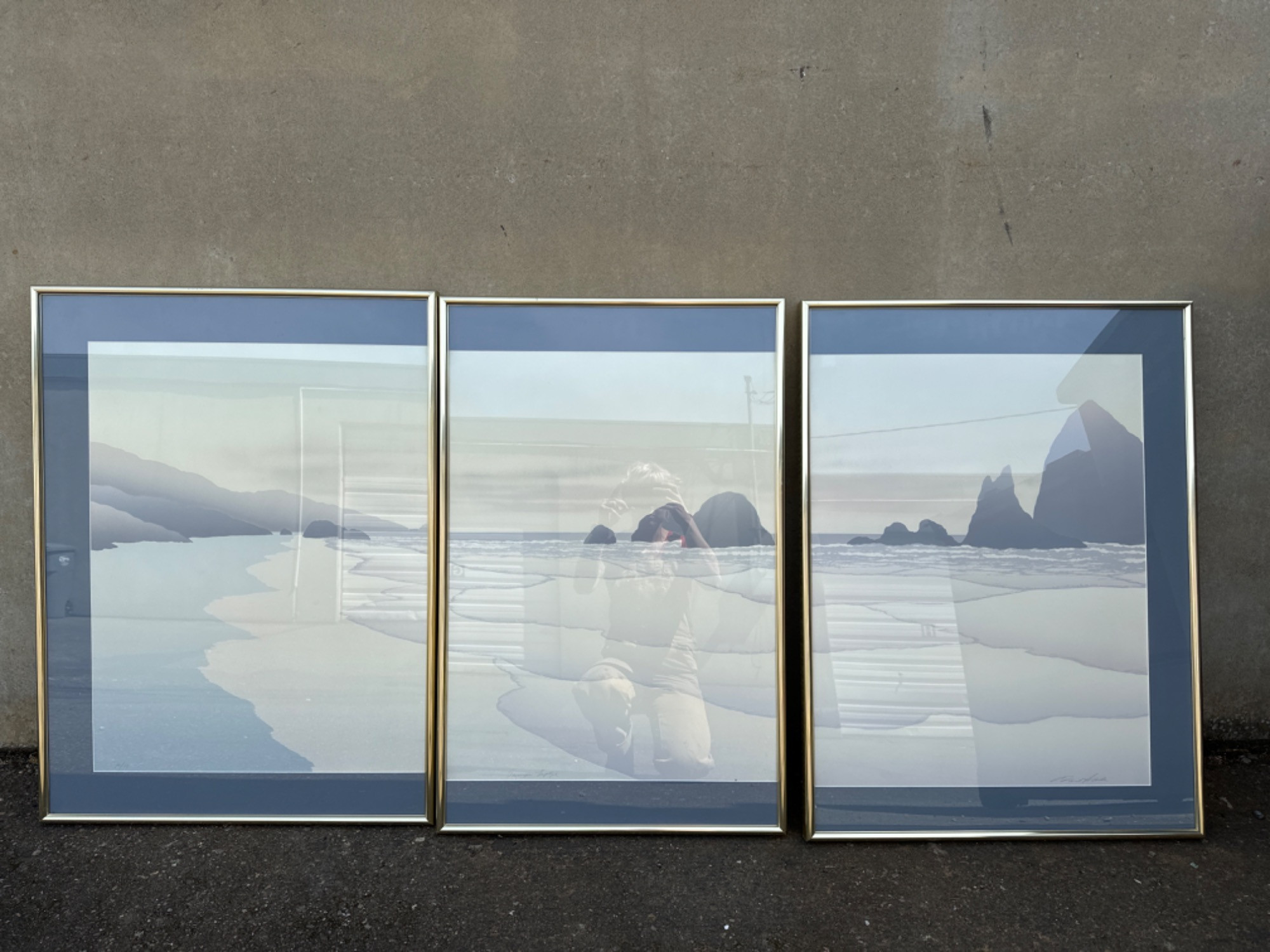 Signed and numbered 1980s Pastel Blues Landscape Seascape Triptych - 14 of 17 Set in metal gold tone frames - have wear (2) end frames measures 34.25" x 25.25" Center frame measures 22.25"