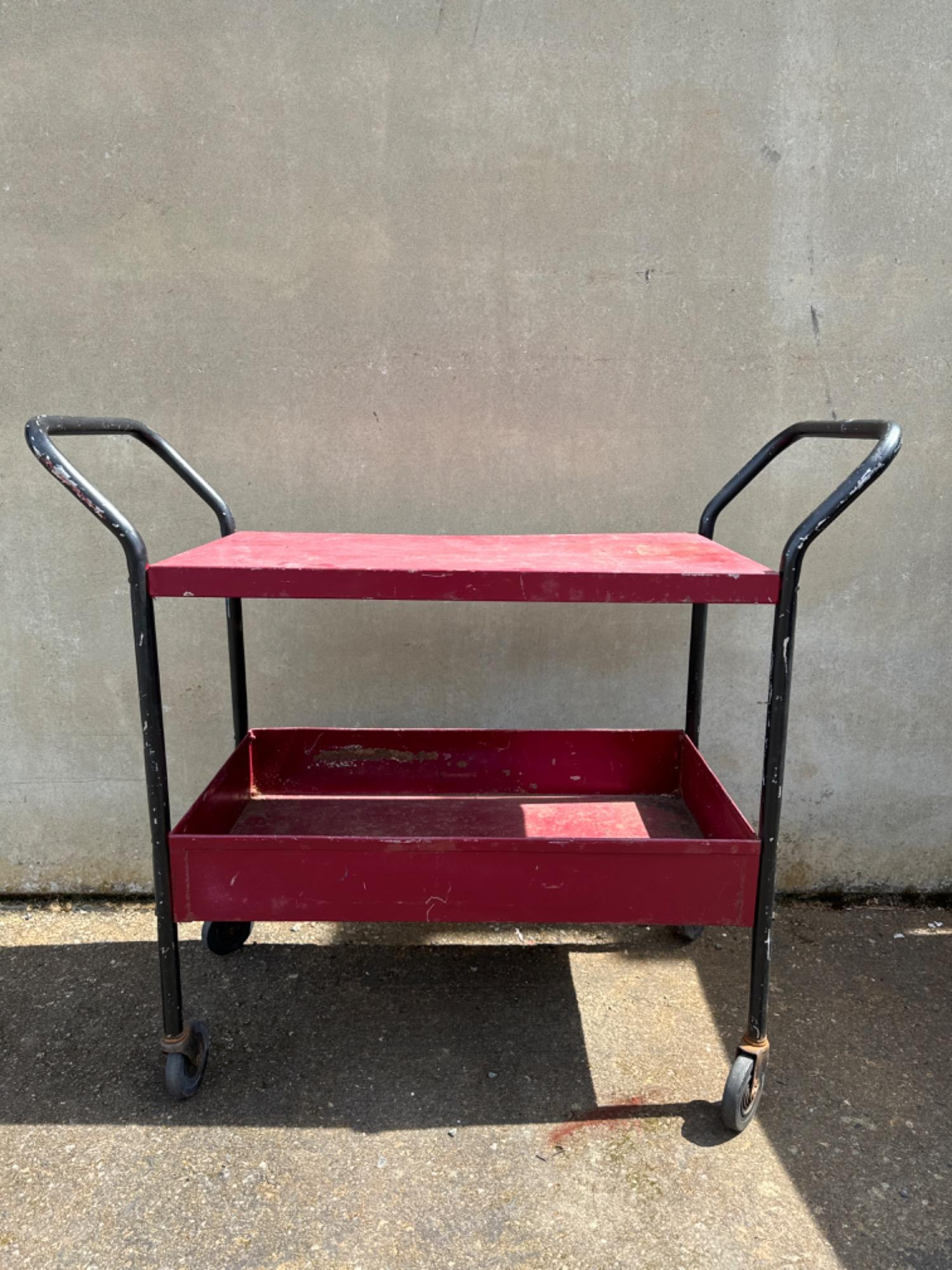 Retro Vintage Industrial Red & Black Metal Cart Heavy duty construction. Measures: 42.25" x 17”W x 37”T One wheel doesn’t roll
