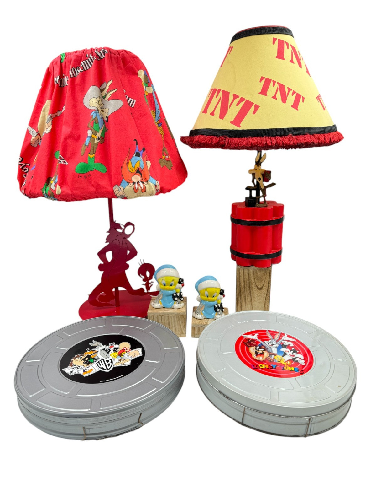 Vintage Looney Tunes Lamps, Decor & Salt & Pepper Shakers Rare Wile E Coyote plastic lamp - 13.5" to socket. TNT lampshade has water stains. Red metal Sylvester lamp - 16"T to top of socket - handcrafted fabric lampshade cover (2) Movie Reel Tin decor Sleepy Time Tweety salt and pepper shakers - have their stoppers. Chip to glaze on one shaker Lamps tested - work