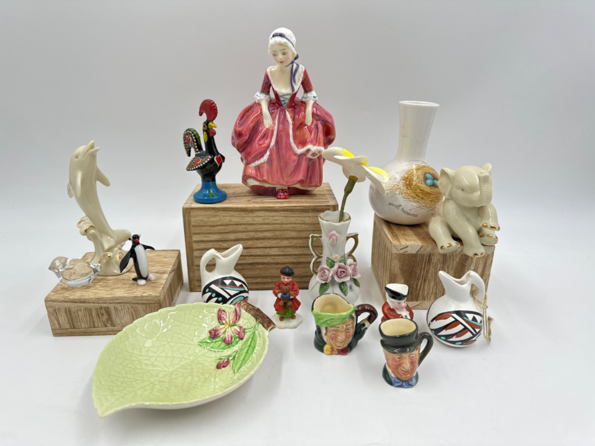 1-5.25"T Carlton Ware trinket dish, Lenox Dolphin & Elephant, Royal Doulton Goody Two Shoes, Royal Doulton Sairey Gamp & Mr. Micawber Miniature 1.25" Toby Jugs, and more All appear to be in great condition