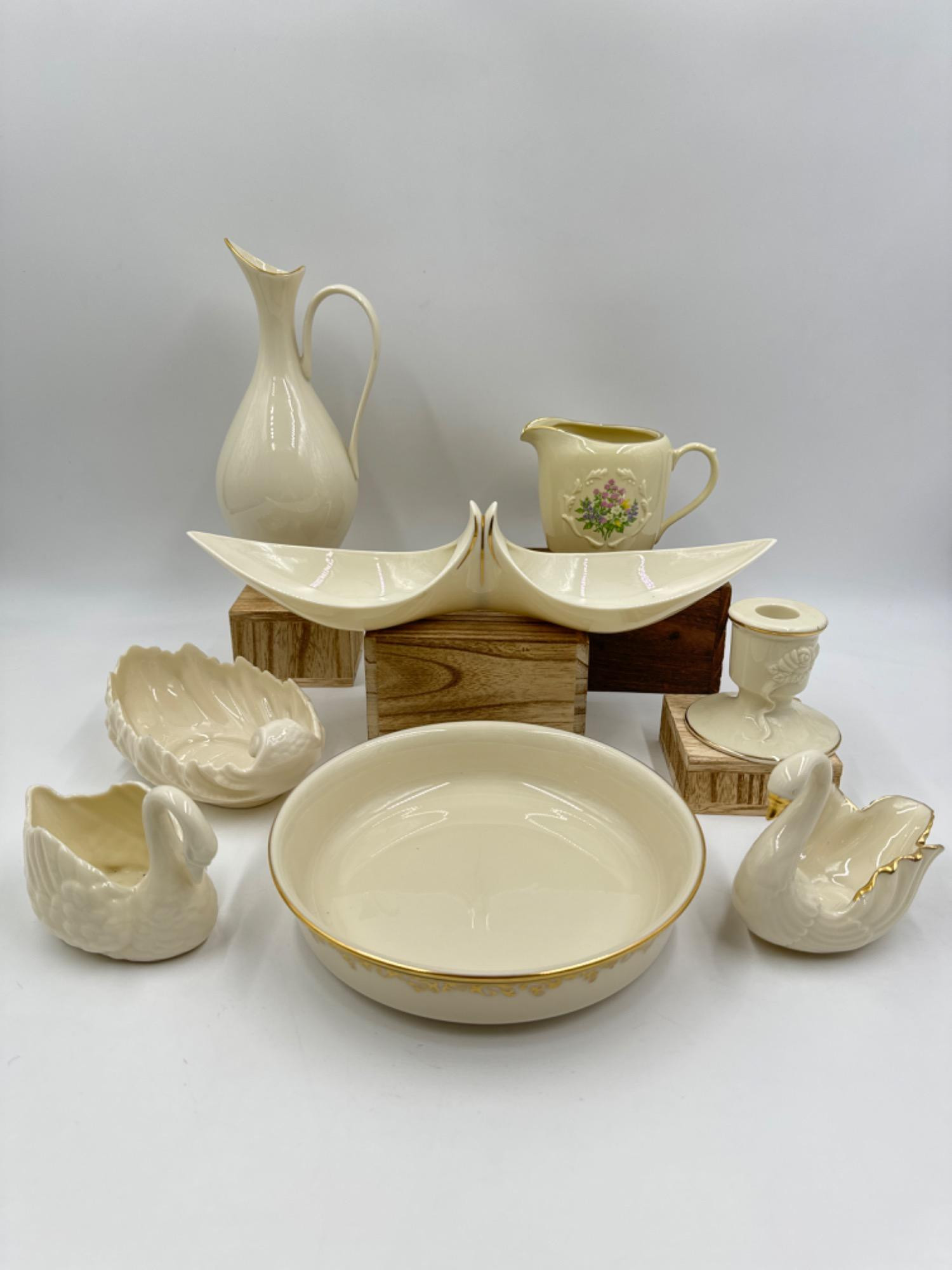 1960s Mid Century duo -13"L relish dish & 9"T pitcher Gold accent swan and blue label swan are approximately 4.5"L Blue Label Shell bowl - 6" Rose Blossom candlestick holder 1995 Spice Garden Creamer Eclipse bowl - 7.5"D