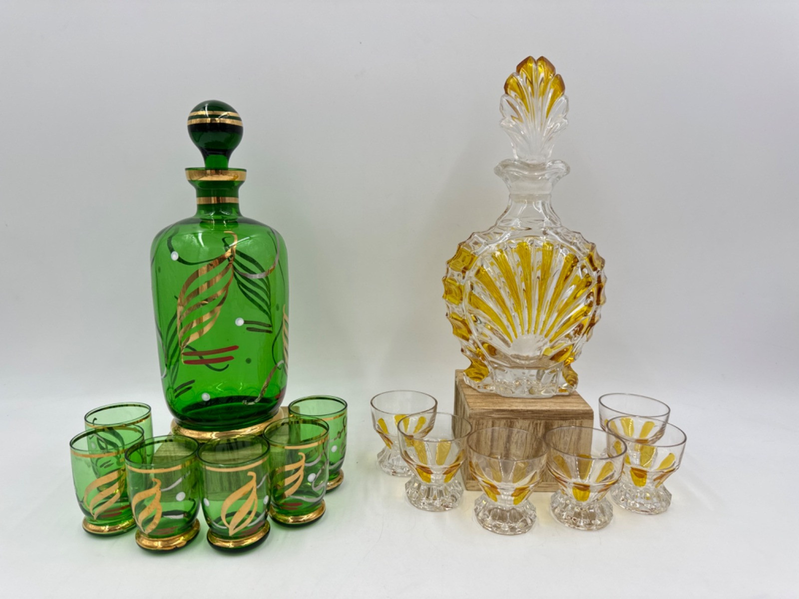 Amber Flashed Shell Decanter 9” with stopper 1 7/8" glasses Green & Gold Accent Decanter 8.5” with stopper 2 1/8” glasses Both sets are in great condition - minimum wear to gold on the green set. Yellow flashed on shell set does not appear to have been used.
