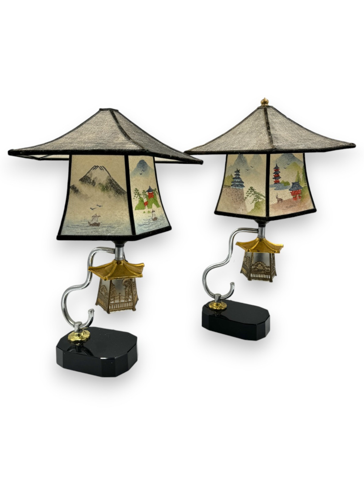 Lot # 90 - Vintage Kitsch Japanese Painted Pagoda Lampshades on Pagoda Lamps