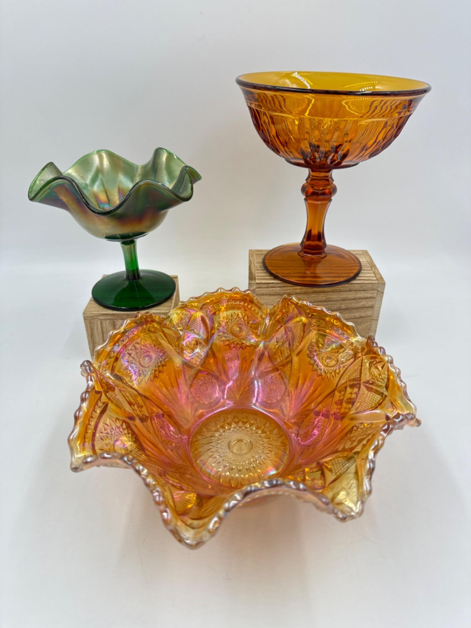 Carnival Cut Glass Ruffled Rim Bowl - 9”D Indiana Amber Glass Honeycomb Pattern Pedestal Bowl - 6.5”T x 6”D Fenton Green Carnival Glass Ruffled Rim Pedestal Bowl - 5”T x 6”D